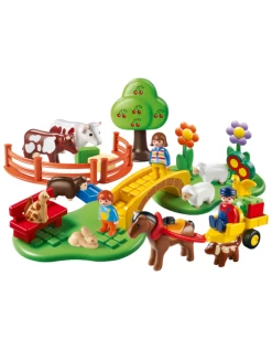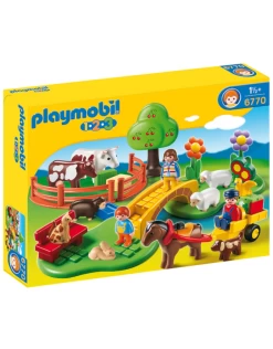 Figures: 1 man, 1 woman, 1 child; Animals: 1 horse, 1 cat, 1 hare, 3 sheep, 1 dog, 2 cows, 1 bird; Accessories: 1 tree (2 parts), 2 flowers, 1 bench, 2 fences, 2 bales of straw, 1 carriage, 1 harness, 2 floor plates, 1 bridge