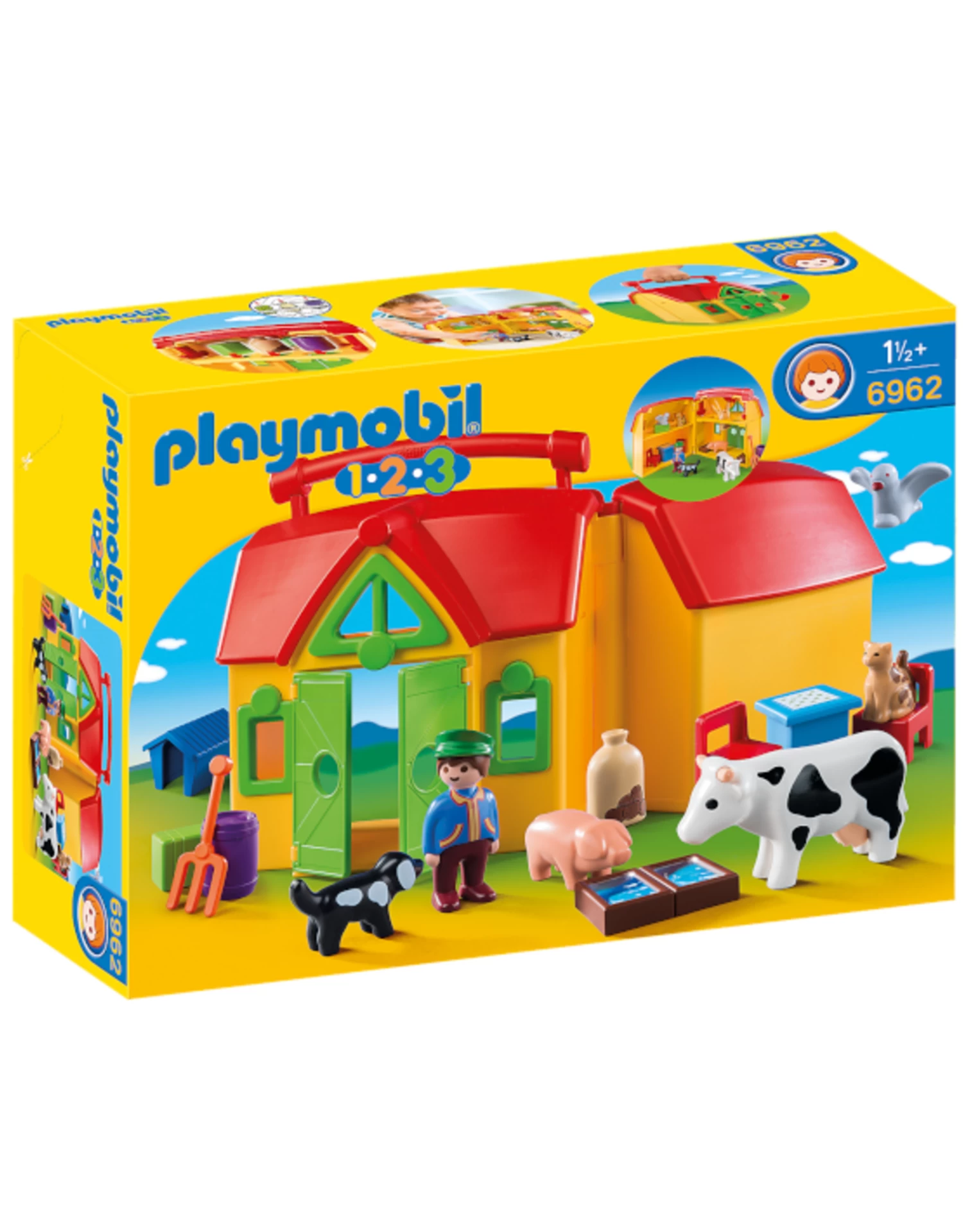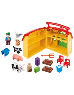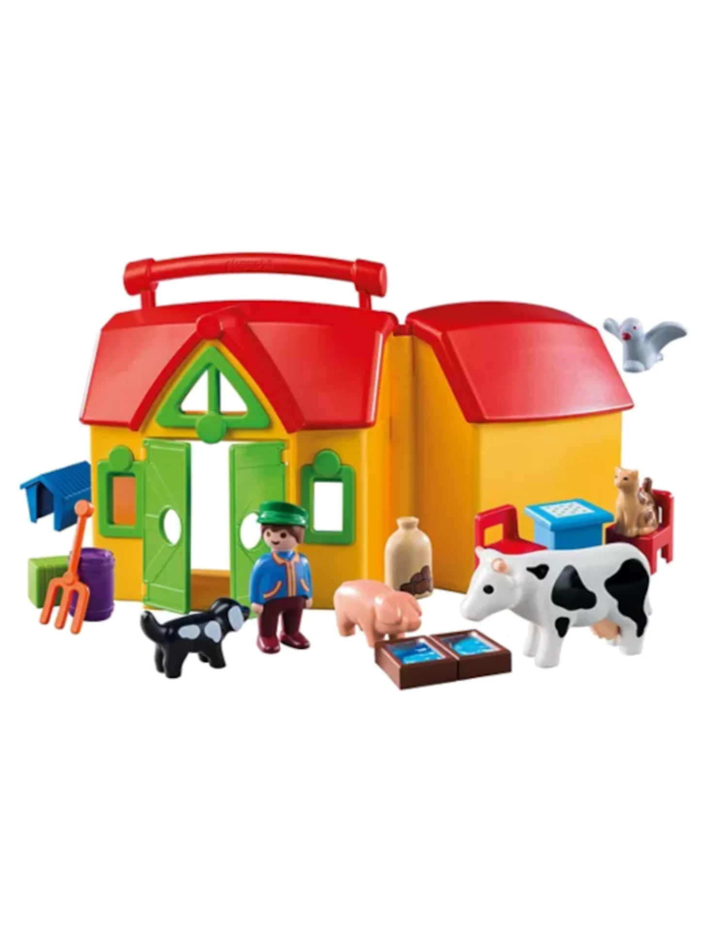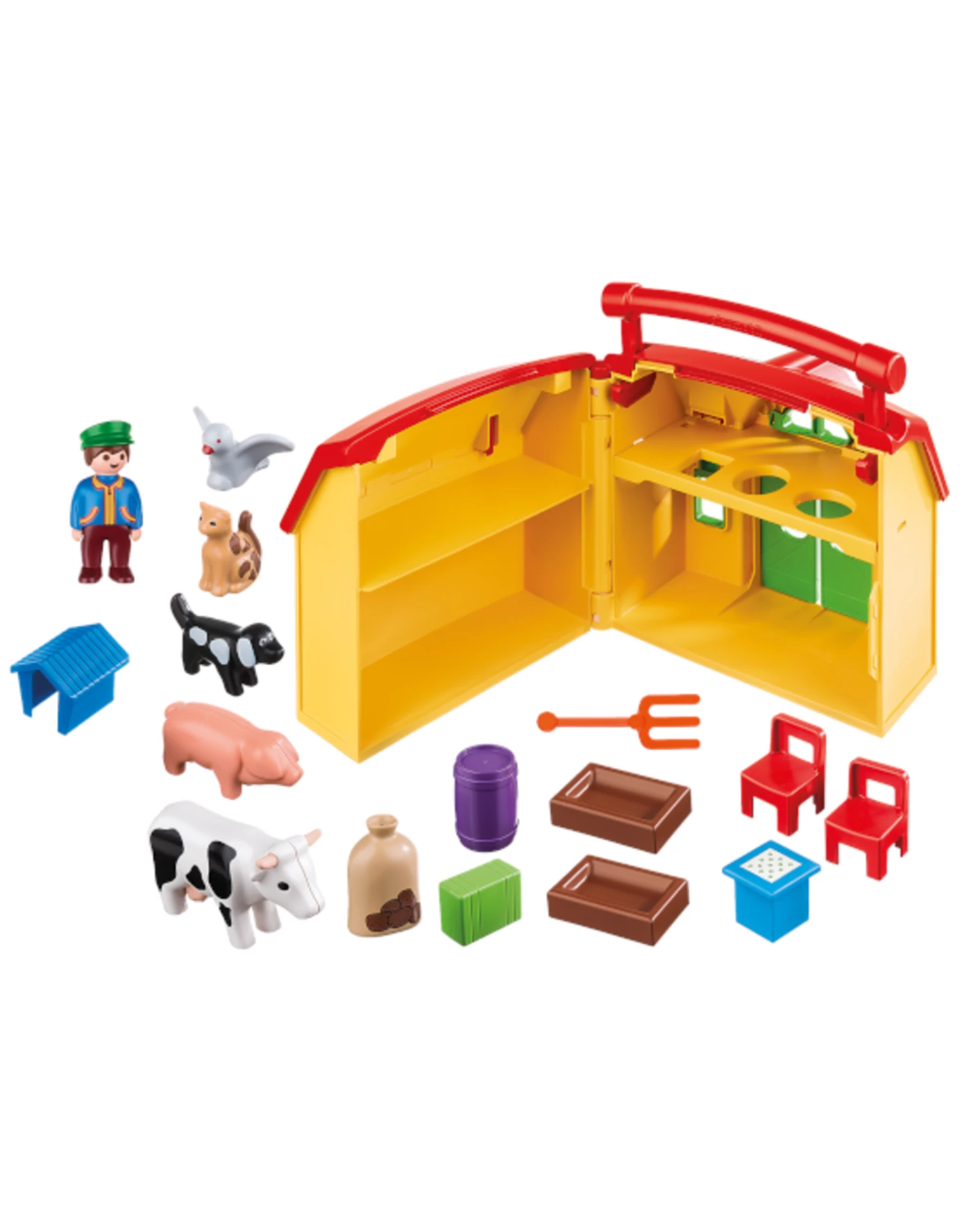 Figures: 1 farmer; Animals: 1 cow, 1 pig, 1 dog, 1 cat, 1 pigeon; Accessories: 1 take-away farm, 2 feeding bowls, 1 barrel, 1 pitchfork, 1 potato bag, 1 bale of straw, 1 doghouse, 2 chairs, 1 table