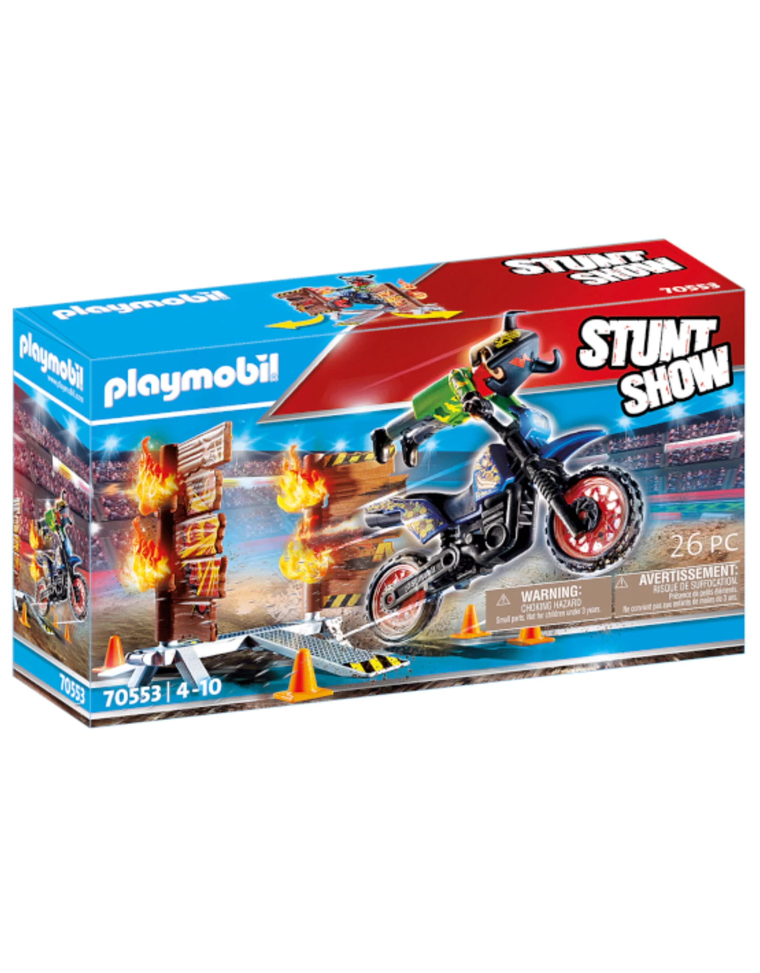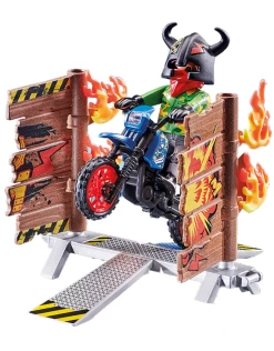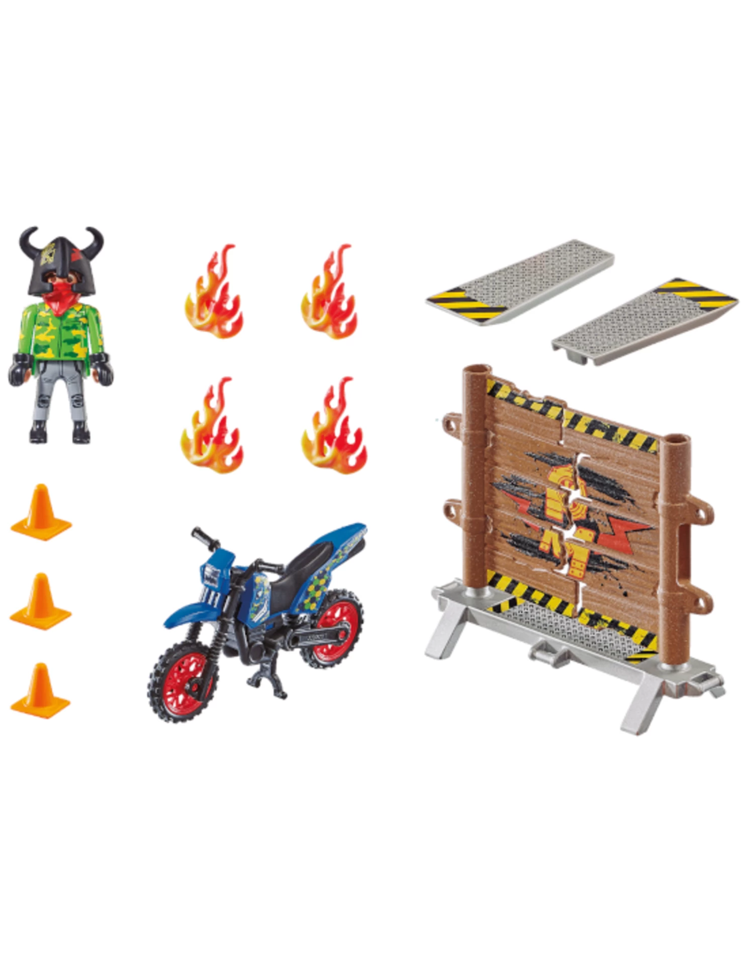 When it comes to spectacular stunts, the motorcyclist is in no way inferior to the heavyweights. The intrepid adrenaline junkie does not shy away from any challenge. At full speed, he races over a ramp directly towards the fiery wall and with verve shoots right through the middle. This stunt rider fears neither flames nor speed. This is not for the faint-hearted! The set contains a PLAYMOBIL motorcyclist, a motorcycle including ski jump and variable board wall, helmet, gloves, scarf and other extras.