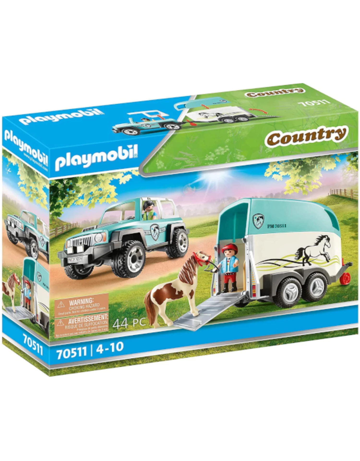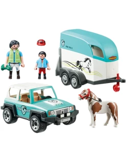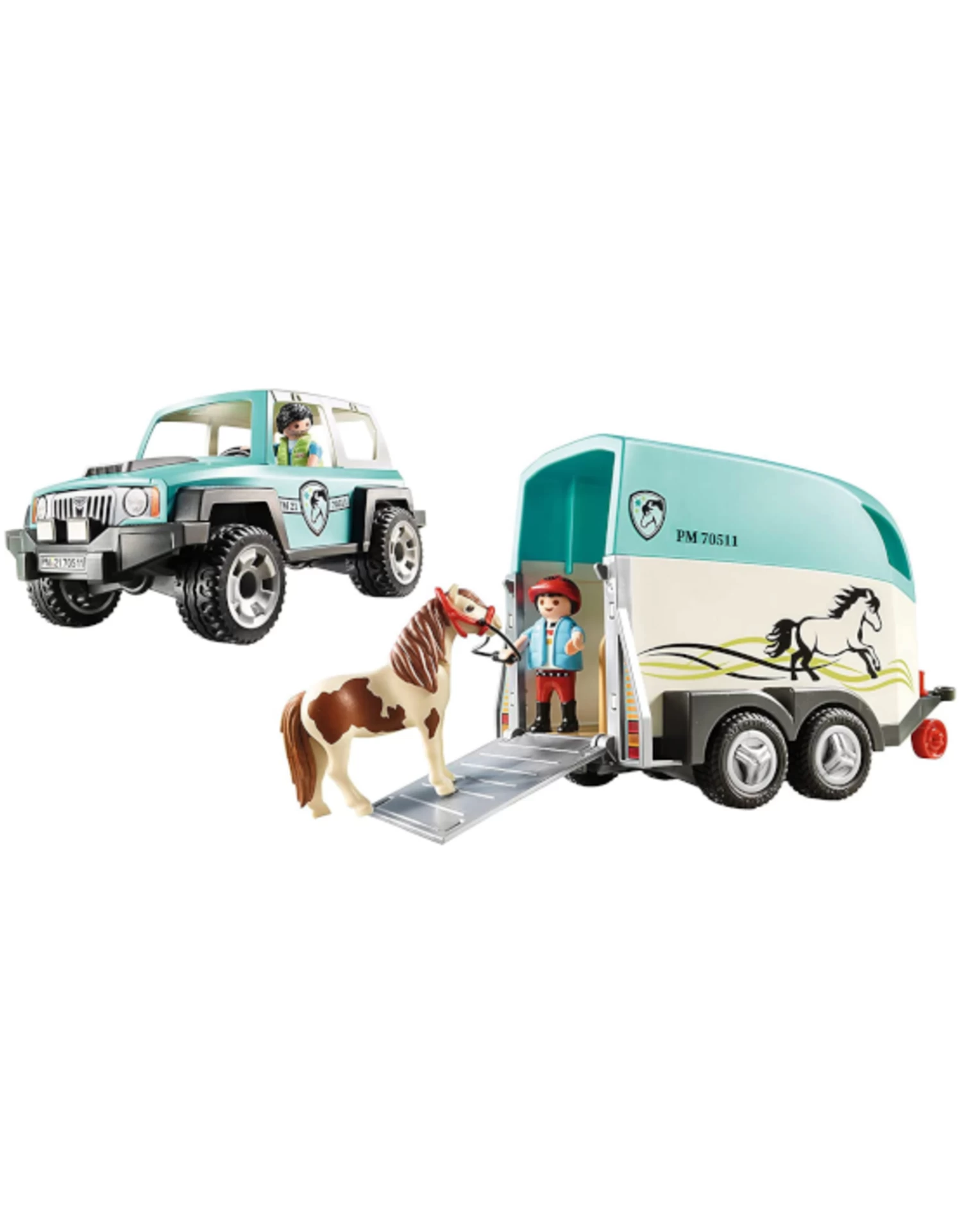 Figures: 1 man, 1 child; animals: 1 pony; Accessories: 1 off-road vehicle, 1 horse trailer, 1 halter, 1 reins, 1 cap