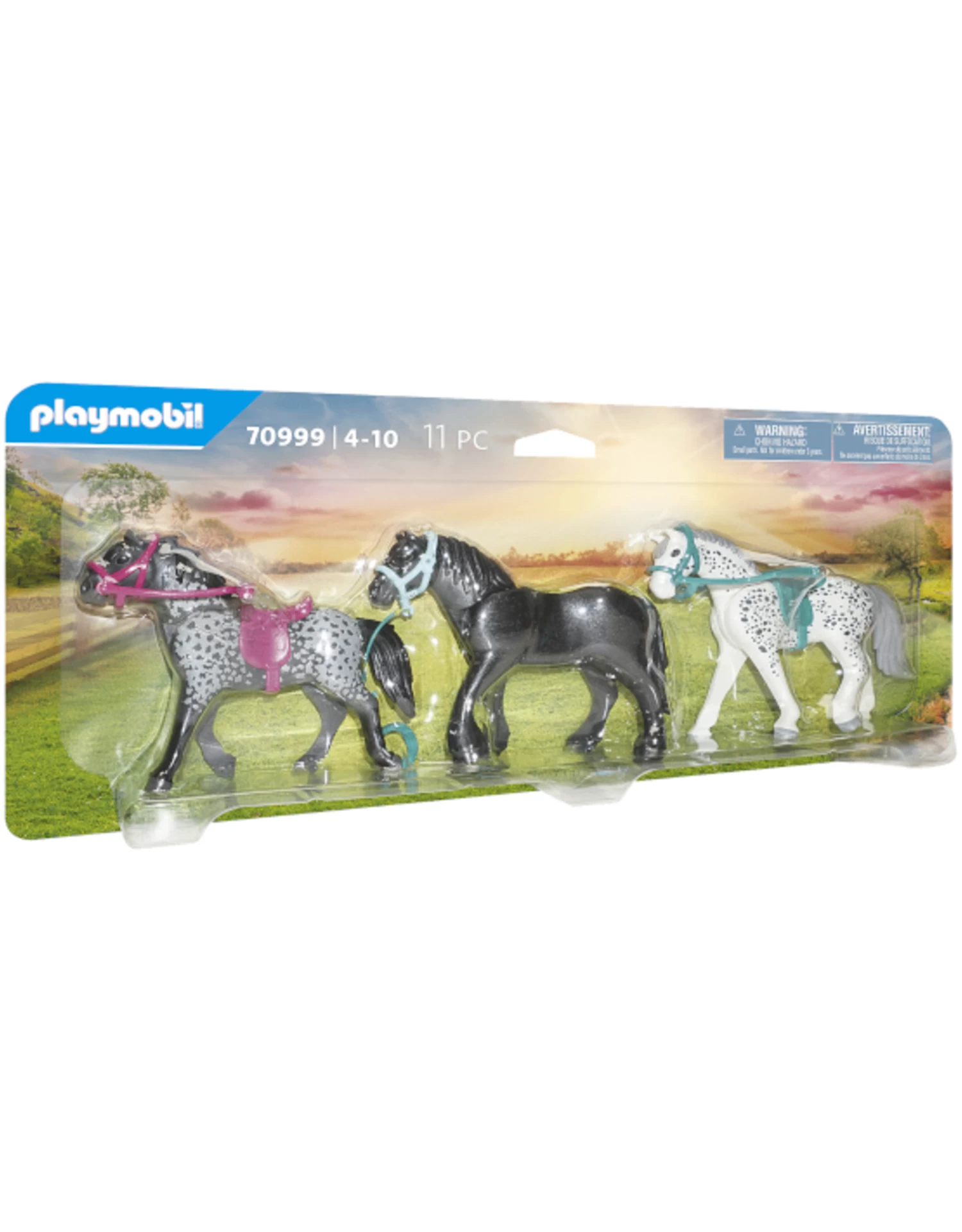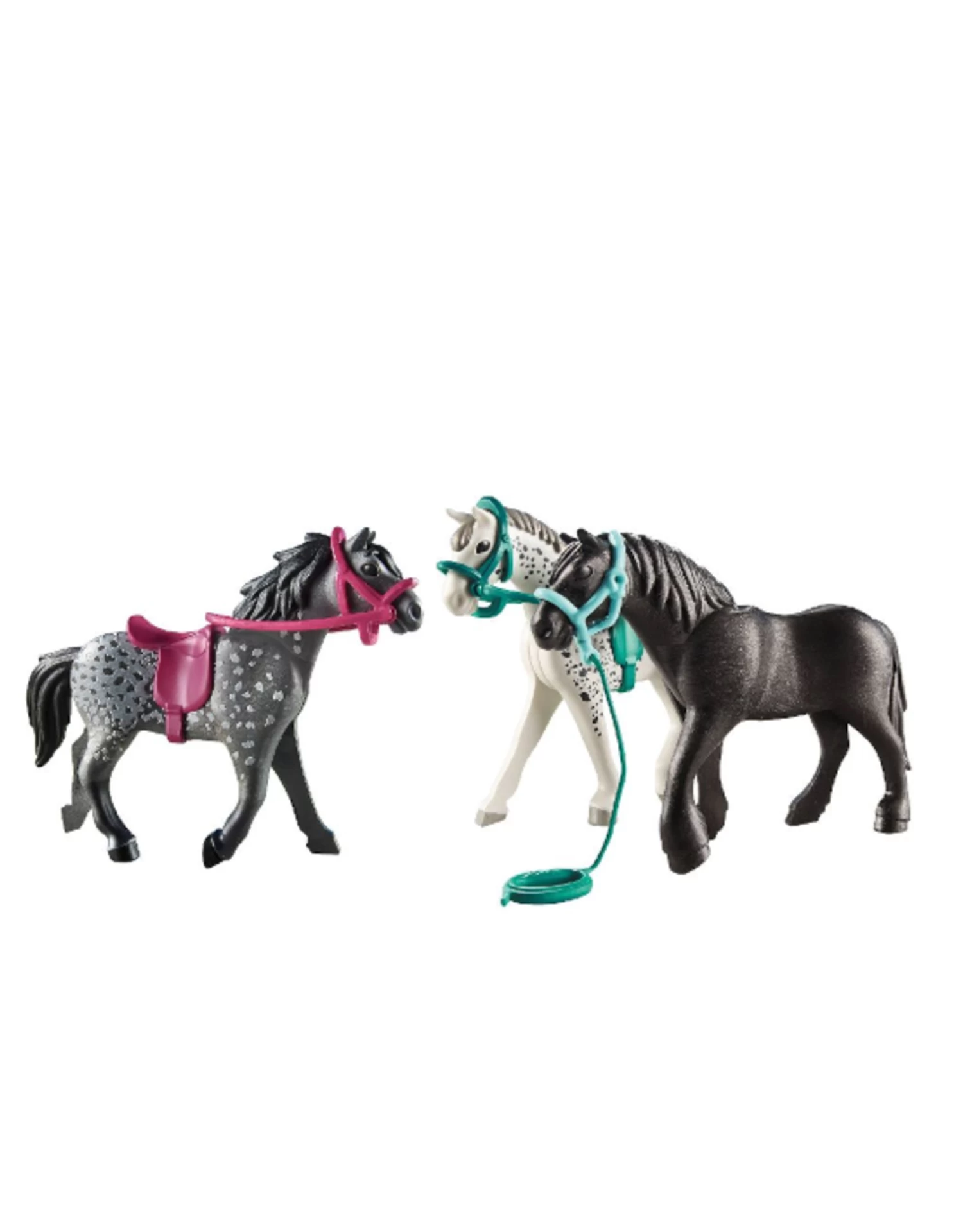 Expand your horse farm with the Horse Trio – a Knabstrupper, Friesian and Andalusian. These majestic animals come with different-colored halters and saddles. The Friesian can be ridden without a saddle. Play with this set on its own or add it to the rest of the PLAYMOBIL Riding Lessons theme (#70995-71000 – each sold separately) for even more horse play! Set includes three horses, three halters and two saddles. Recommended for ages four to ten years old. Warning. Choking Hazard. Small parts. Not for children under 3 years.