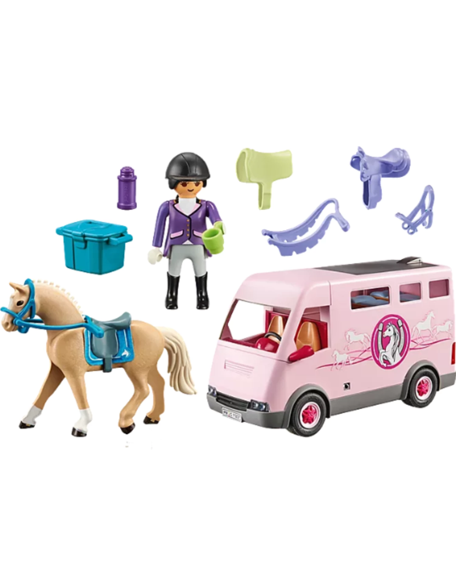 Animal-loving kids from the age of 4 will be thrilled with this PLAYMOBIL playset. The richly detailed toy set contains everything horse fans need to experience countless imaginative riding adventures, such as a horse transporter, riding utensils and, of course, a horse. The practical horse transporter offers space for two PLAYMOBIL figures and has many exciting features such as a fold-out ramp, a trailer coupling and roof inserts for removal. For transport, the horse is led into the vehicle interior via the side ramp. Riding gear and transport box can be stowed in the trunk. Should the excursion take longer, there are two sleeping berths above the trunk area.