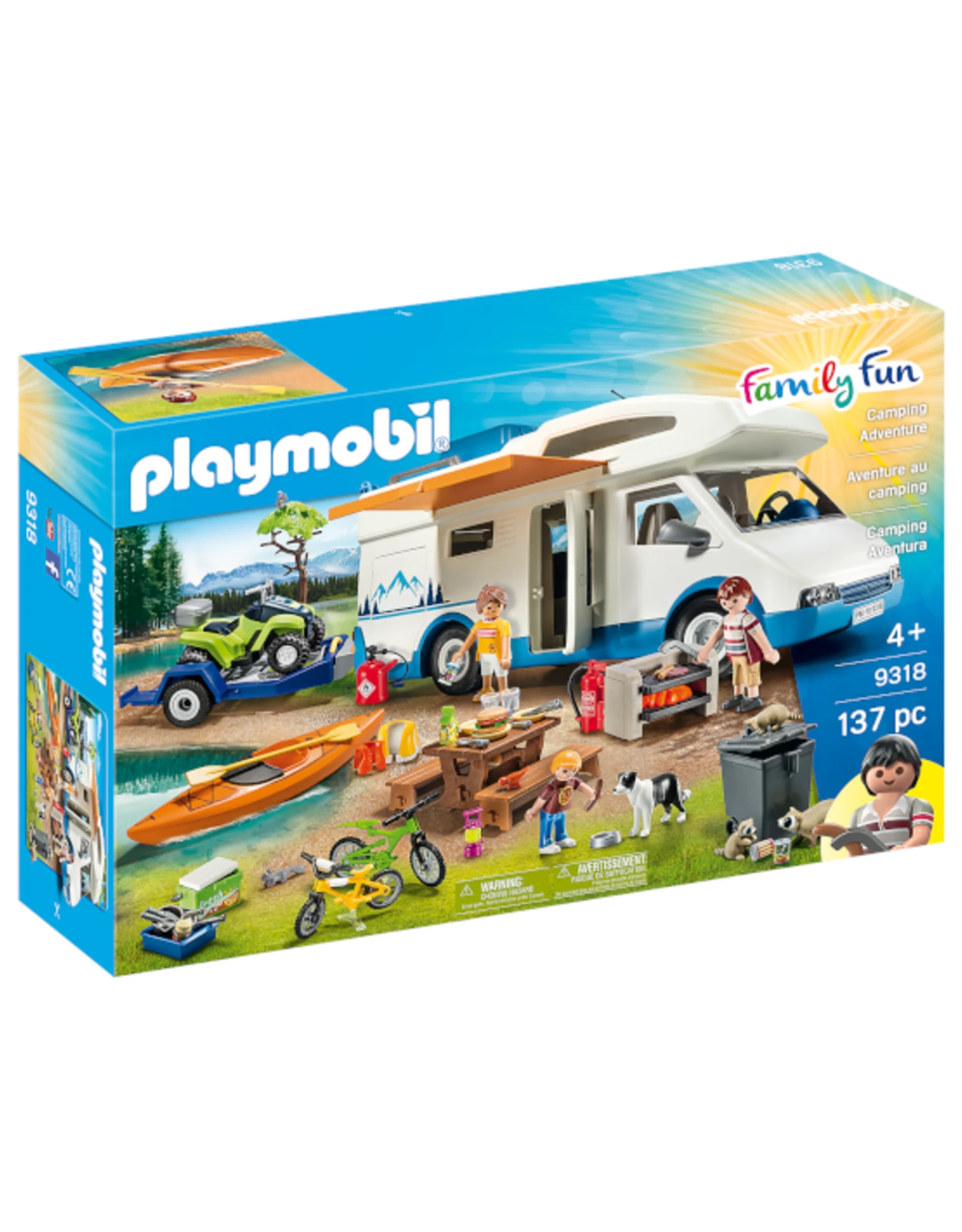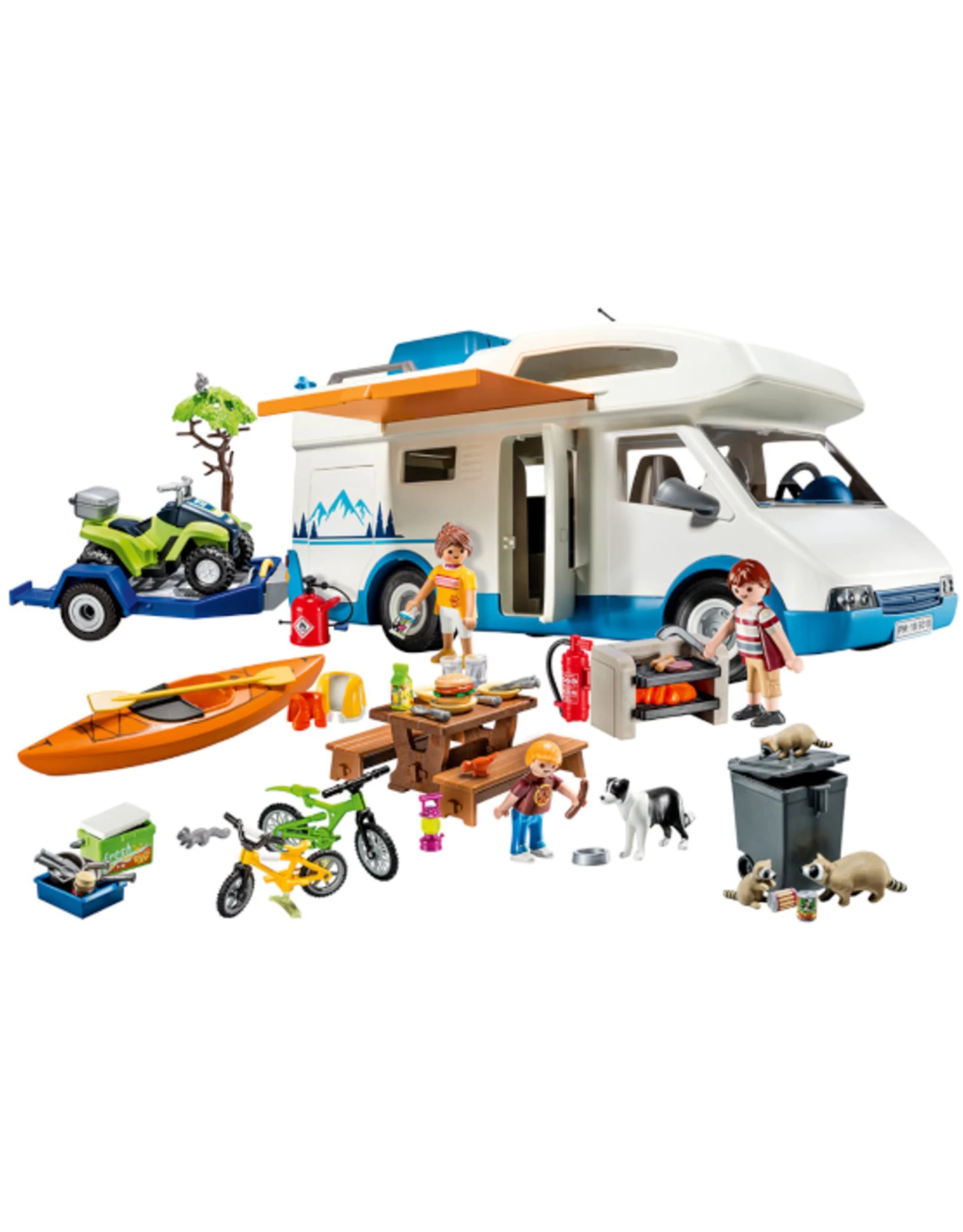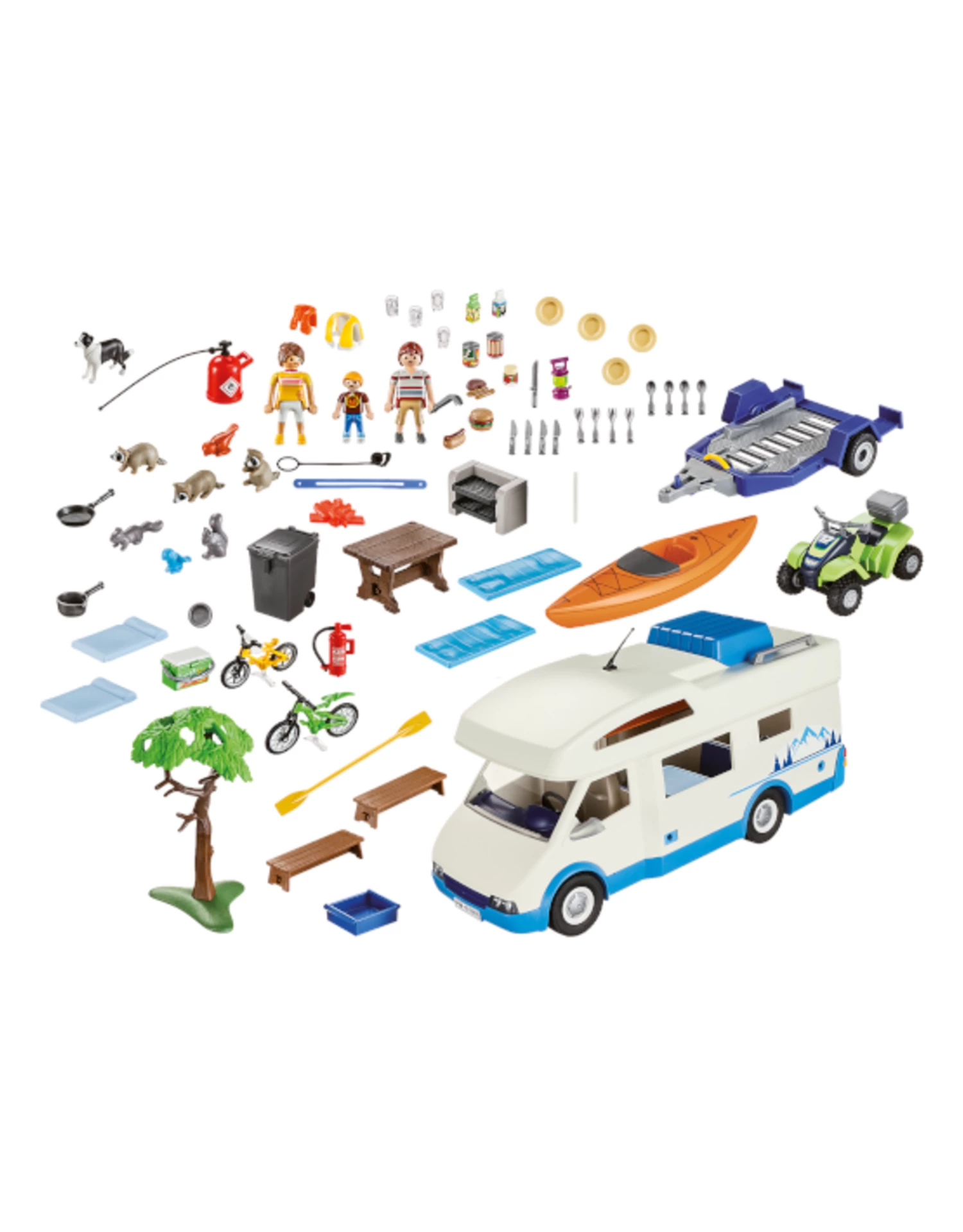 Figures: 1 woman, 1 man, 1 boy; Animals: 1 dog, 3 raccoons, 2 squirrels, 2 birds; Accessories: 1 camper, 1 canoe, 1 oar, 1 quad, 1 boat trailer, 1 tree, 2 benches, 1 table, 2 beds, 1 casserole, 1 pan, 1 gas cartridge, 1 washing powder, 1 fire extinguisher, 2 bicycles, 1 garbage can, 1 box, 1 campfire, 1 line, 2 life jackets, 4 glasses, 1 pair of grill tongs, 1 juice carton, 1 milk carton, 2 tins, 1 steak, 2 sausages, 1 hot dog, 1 hamburger, 1 ketchup jar, 1 large knife, 4 plates, 1 lantern, 4 knives, 4 forks, 4 spoons, 1 grill, 2 mattresses