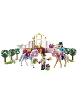 Figures: 1 princess, 1 riding instructor Animals: 2 horses, 1 bird Accessories: 1 stable element with drawer and fences, 2 rose hedges, 2 crops, 2 riding helmets, 1 horse crown, 2 saddlecloths, 2 saddles, 2 side saddles, 2 reins, 2 halter, 1 set of horse accessories (6 pieces), 1 hooped skirt with flowers, 1 hair ring, 1 hat with feather, 4 clip-on bows, 1 pair of arm cuffs, 1 flower vase, 7 roses, 1 watering can, 1 basket, 1 bouquet of flowers with flower paper, 1 pair of garden scissors, 1 bucket, 2 carrots, 2 apples, 1 basket with grass, 1 feeding rack, 1 container, 1 bundle of grain, 1 bale of straw