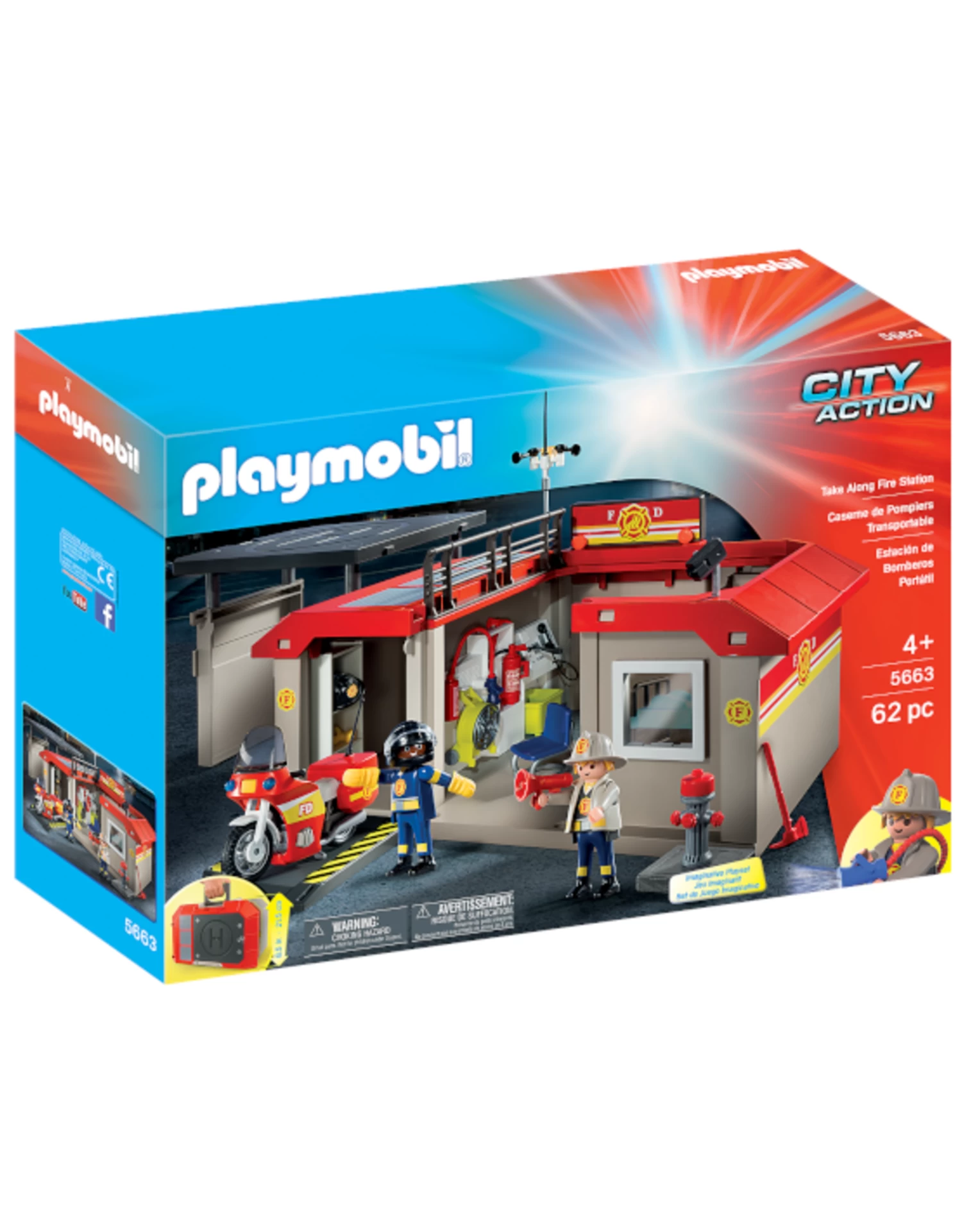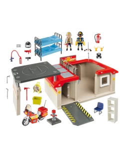 Figures: 2 firefighters Accessoires: 1 fire station, 1 motorcycle, 2 fire helmets, 1 motorcycle helmet, 1 fire hydrant, 1 fan, 1 fire extinguisher, 1 command desk, 1 chair, 1 bunk bed, 1 security camera, 1 shelf, 1 axe, 1 megaphone, 1 ramp