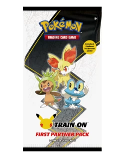 A big celebration—with gigantic Pokémon TCG cards! This First Partner Pack contains a set of 3 awesome oversize cards for your Pokémon TCG collection, featuring the three first partner Pokémon of the region, plus two regular Pokemon TCG booster packs! Collect your favorites, trade them, and celebrate 25 awesome years of Pokémon with the first partners who stick with you from your very first Pokémon moments!