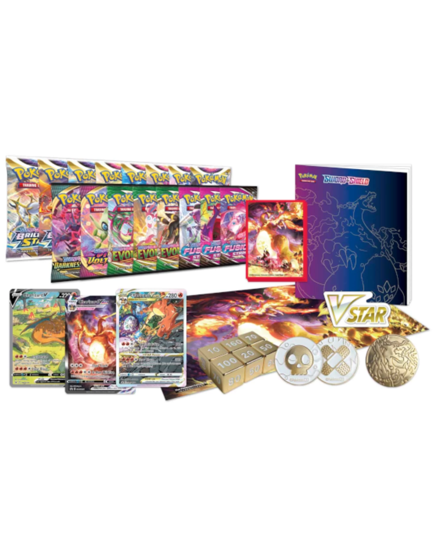 Celebrate the Sword & Shield Series and the era of Pokémon V, Pokémon VMAX, and Pokémon VSTAR with a hotshot who knows how to put all that power to good use! Charizard turns up the heat as a trio of promo cards with an etched foil treatment, and its Gigantamax form shows off blazing style on a playmat, metal coin, and set of card sleeves. Metal dice and condition markers round out this ultimate set of gameplay accessories. And as you open the huge stack of booster packs inside this box, take a journey through the Sword & Shield Series with an original booklet full of images and stats!