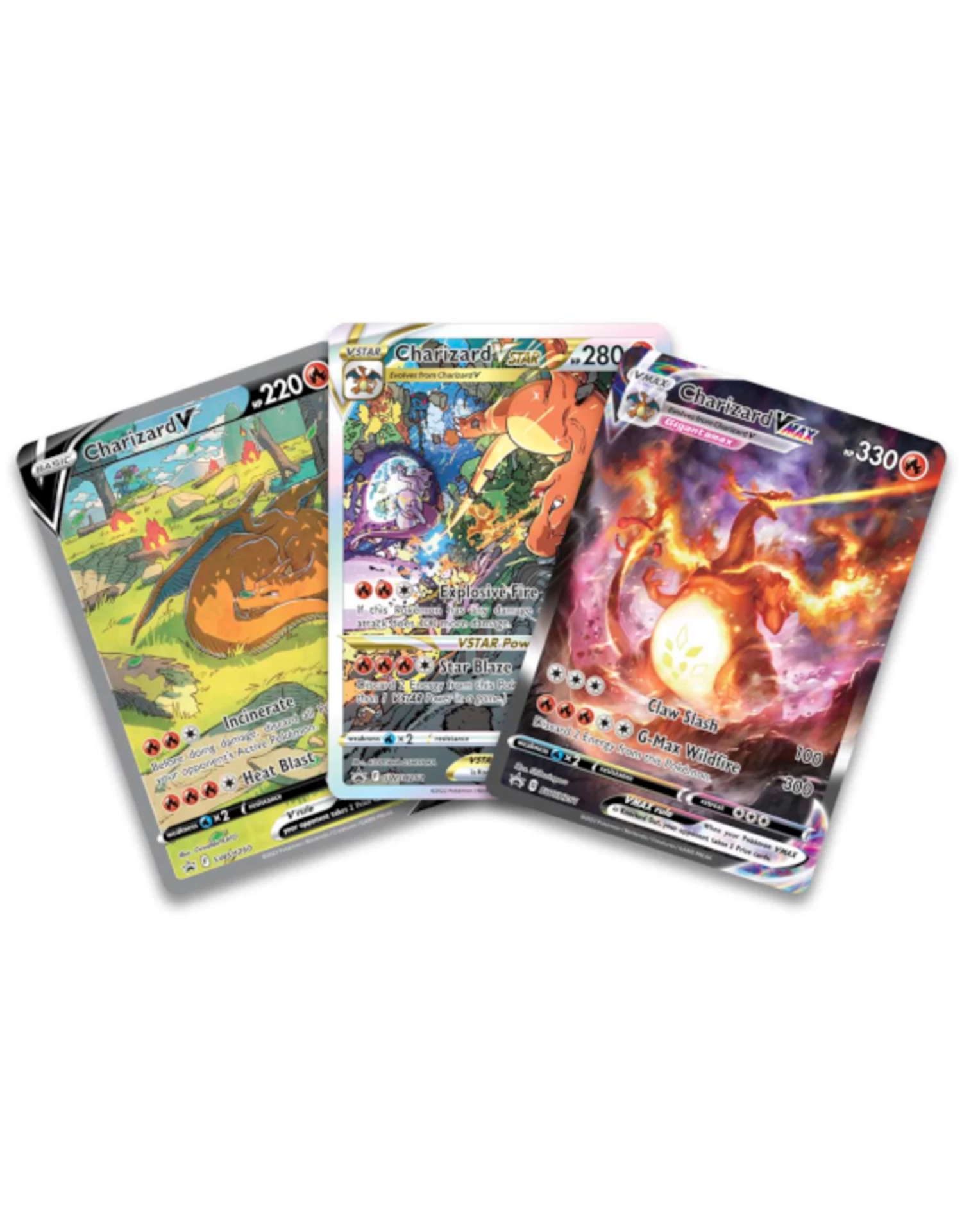 - 3 etched foil promo cards: Charizard V, Charizard VMAX, and Charizard VSTAR
