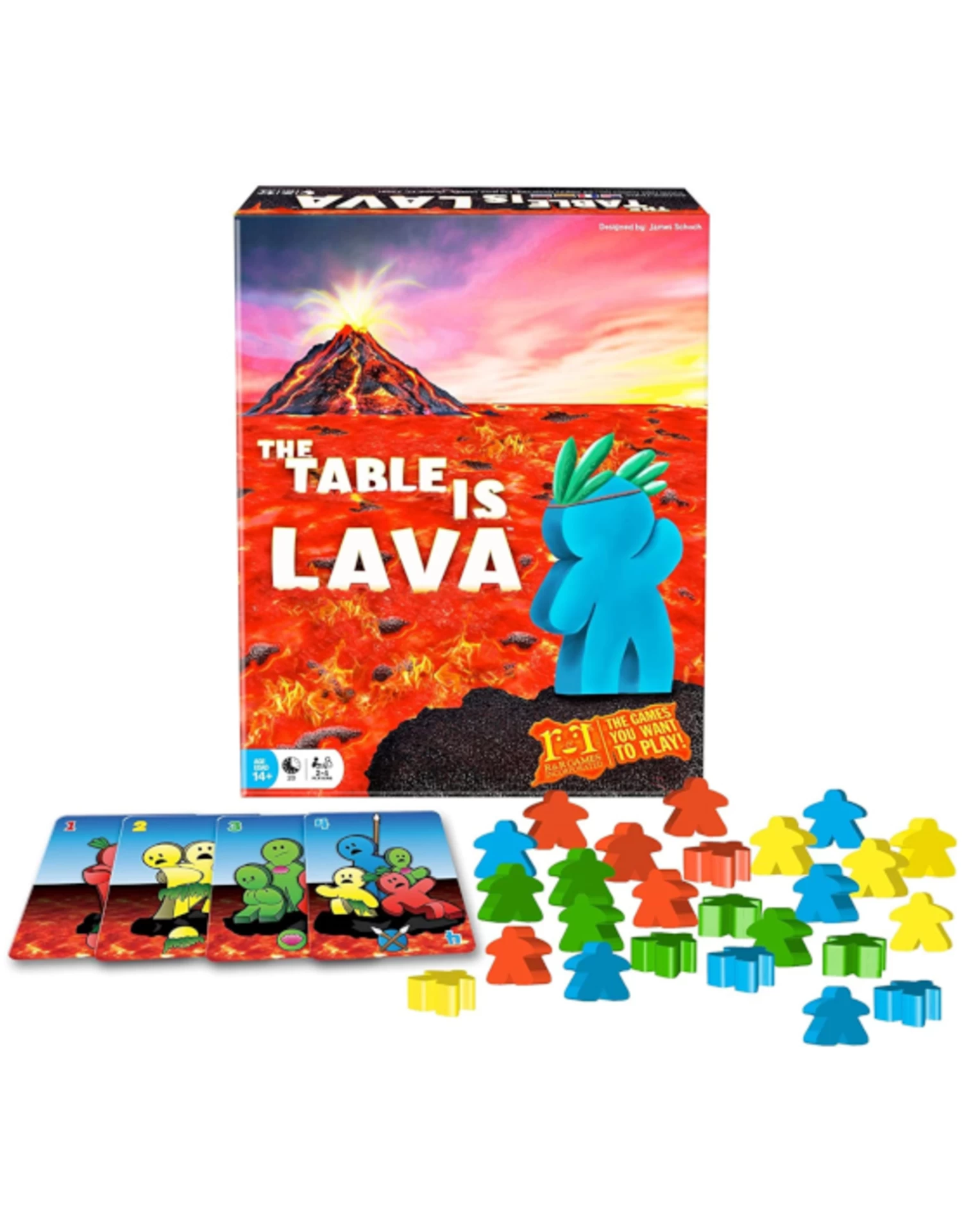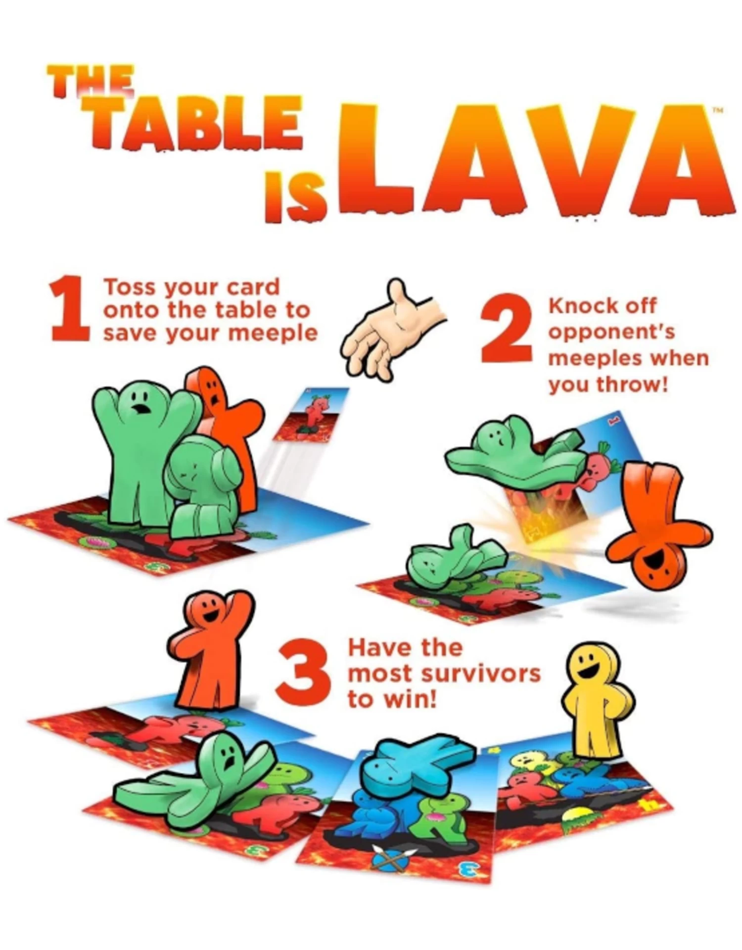 As dawn breaks, Mount Kahlualualuau is spewing its fiery lava down onto Meepleville. The Table Is Lava presents players with a simple challenge: Toss cards onto the table to save your meeples, while trying to knock other players’ pieces into the lava at the same time. Have the most survivors, and you win!