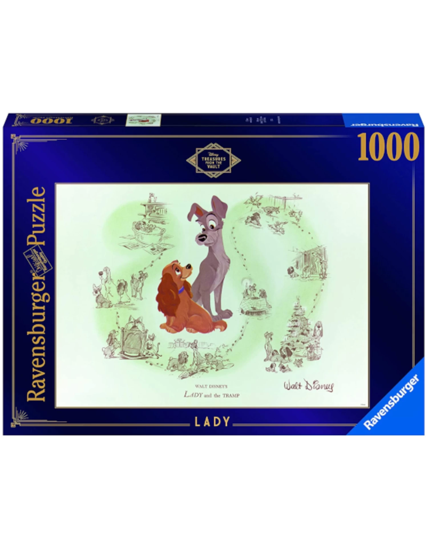 One Christmas around 1930, Walt Disney really surprised his wife when the gift he gave her started wiggling! The hatbox topped with a large bow hid an adorable puppy, inspiring a similar scene in the 1955 animated movie, Lady and the Tramp; Jim Dear gives Darling a striped hatbox, and out pops a precious puppy she names Lady! Our puzzle highlights classic scenes from the movie as the pampered Lady befriends the scrappy stray mutt, Tramp. Nostalgic (and challenging) puzzle fun for any Disney fan!
