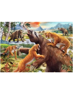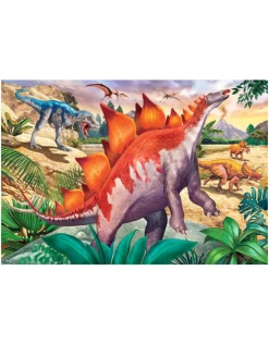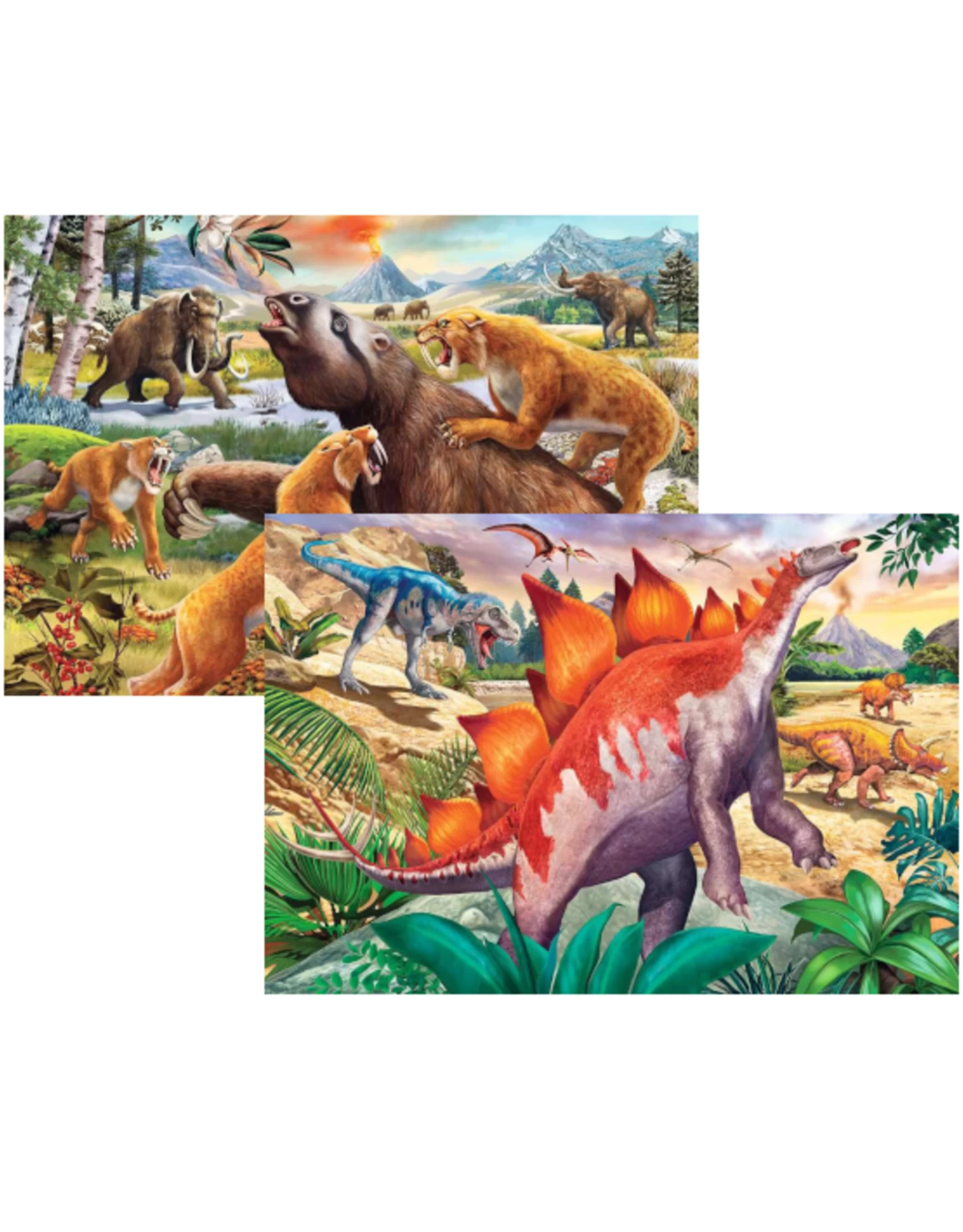 Our inventive illustrations combine dinosaurs and wildlife from several epochs, illustrating their different eating habits! An herbivorous Stegosaurus reaches for a tasty leaf, while the bluish Piatnitzkysaurus and Triceratops search for a meal and Pterodactyl keep watch from above. In the second scene, an unfortunate Megatherium (related to today’s sloths) may become a meal for the carnivorous Smilodon (aka saber-toothed tigers) as Woolly mammoth roam the land. It’s roaring good puzzling fun!