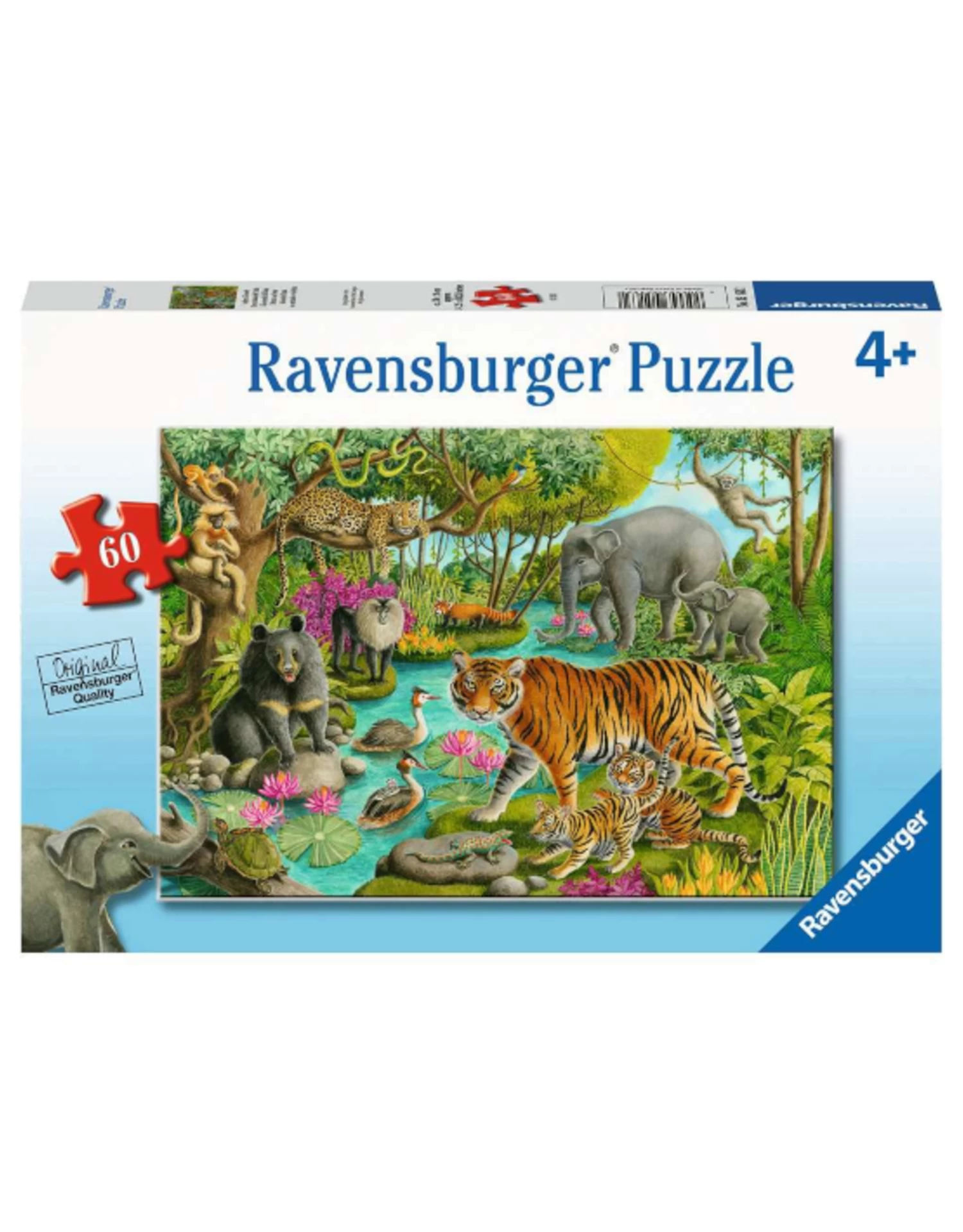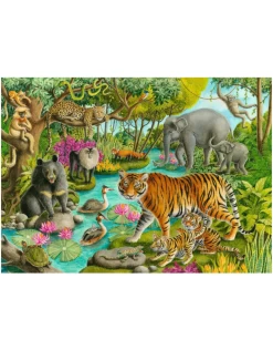 The trees in this Indian forest are teeming with wildlife like golden langur monkeys, a leopard and a Lar gibbon! An Asiatic black bear, lion-tailed macaque, red panda and Asian elephants stay close to the fresh water, where a pair of Great Crested Grebe birds swim; can you spot their youngster? The Bengal tiger cub isn’t sure about that spotted green gecko! Puzzles help develop hand-eye coordination, fine motor skills and problem-solving through repeated practice while delivering some wild fun!