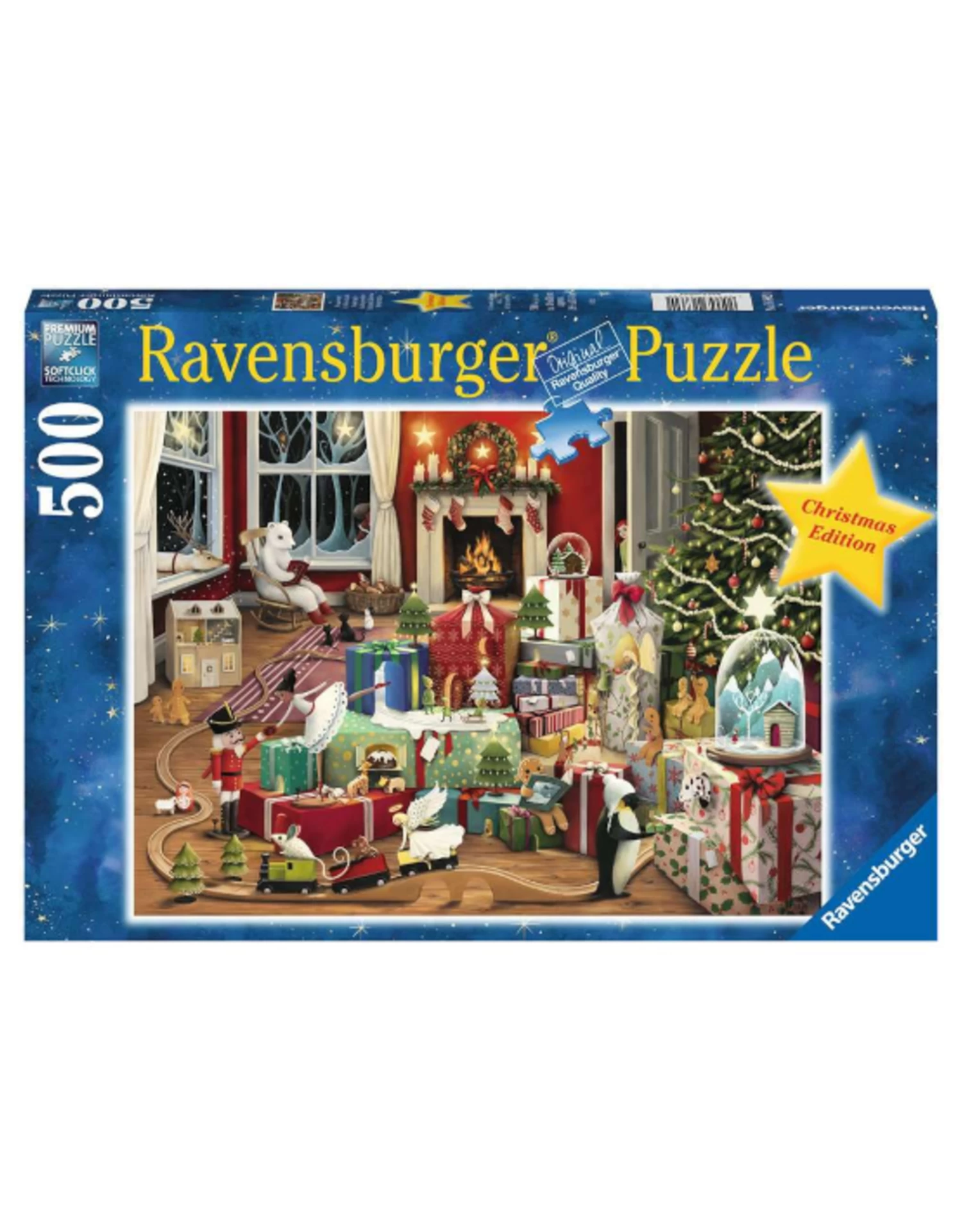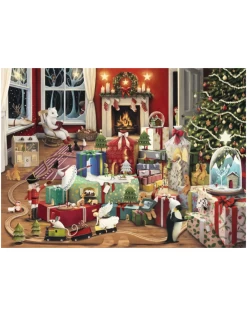 Christmas magic is in the air, and puzzling our charming scene is sure to become a favorite holiday tradition! A pile of presents sets the stage for Christmas Eve enchantments, where a penguin pays a call, and a mouse makes merry giving train rides to Brio Horsey and Annie Angel. Just look out the window for a glimpse of jolly old St. Nick! Artist Demelsa Haughton created this warm, inviting scene full of whimsy and wonder sure to add magical moments to your holiday puzzle fun year after year!