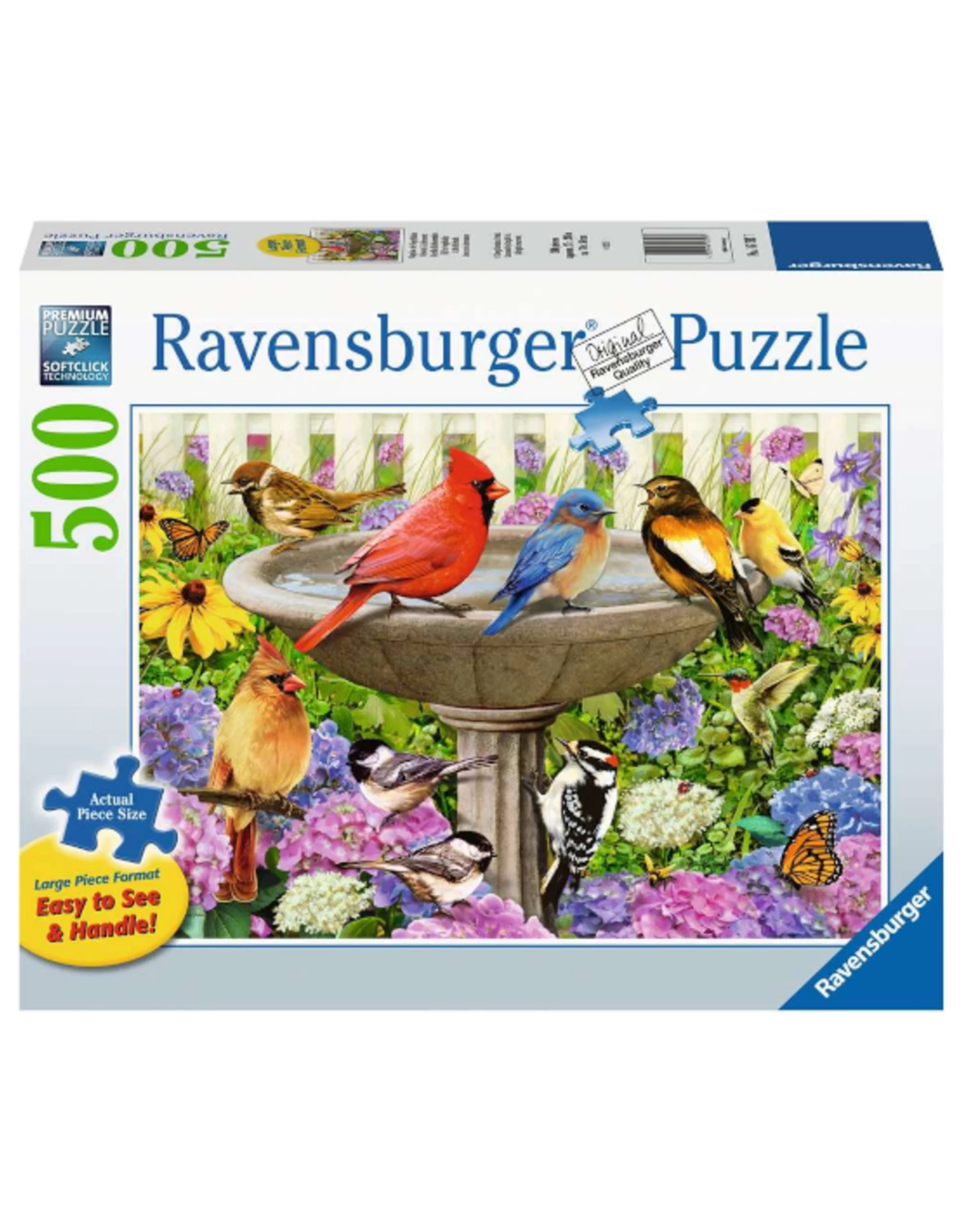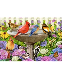 Nestled among multi-hued hydrangeas and sunny-yellow rudbeckia, this lovely birdbath is the place colorful feathered friends flock to! Mr. Evening Grosbeak seems to be on a roll about something, while the Northern Cardinal and Eastern Bluebird patiently wait to get a word in edgewise. The sparrow may be muttering to the passing monarch butterfly, but the American Goldfinch just came for a quick drink and is staying out of it. Fun for all and a perfect puzzle for any bird-watcher or nature-lover!