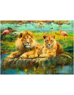This beautiful painting shows a proud and protective male and female lion with their young cub. They relax by the cooling waters, whilst behind them flamingoes and other birds search for food. Be like our lions and relax from the pressures of daily life. Our 500 piece jigsaws are crafted with FSC premium quality and measure 49 x 36cm when complete. Great for Adults and ideal puzzles for Children 10 years old and up. Fully complies with all necessary UK and EU testing standards.