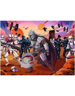 The odds don’t look good for our heroes in this imagined illustration of The Mandalorian! Surrounded by stormtroopers and Dark Troopers, Grogu may be small, but the Force is strong with this one and his powers may just save the day! Though originally hired to deliver Grogu to the Client, Mandalorian bounty hunter Din Djarin has sworn to protect “Baby Yoda” and return him to the Jedi. But Moff Gideon wants him, and he wields the Darksaber of Mandalore — can Grogu and Mando escape?