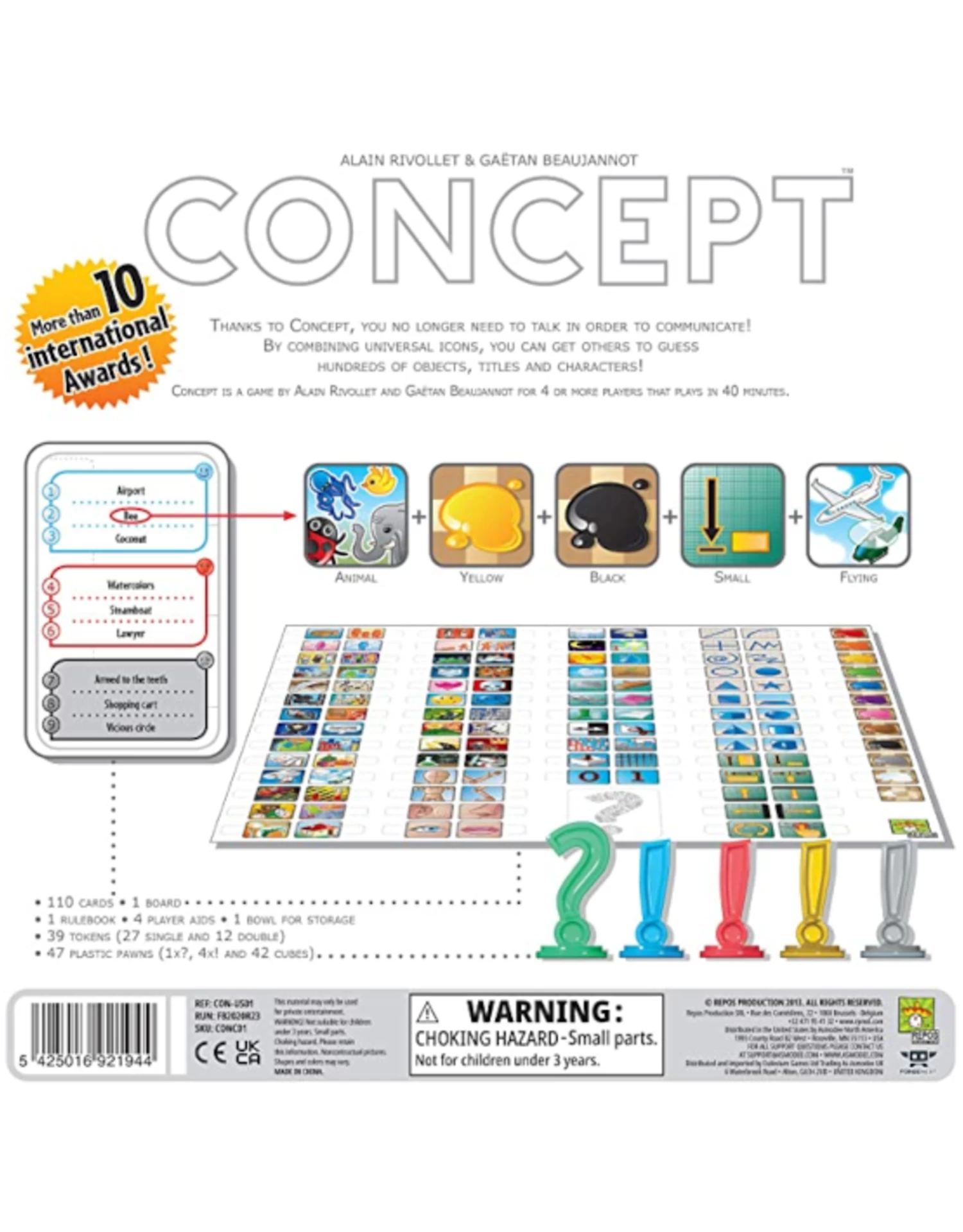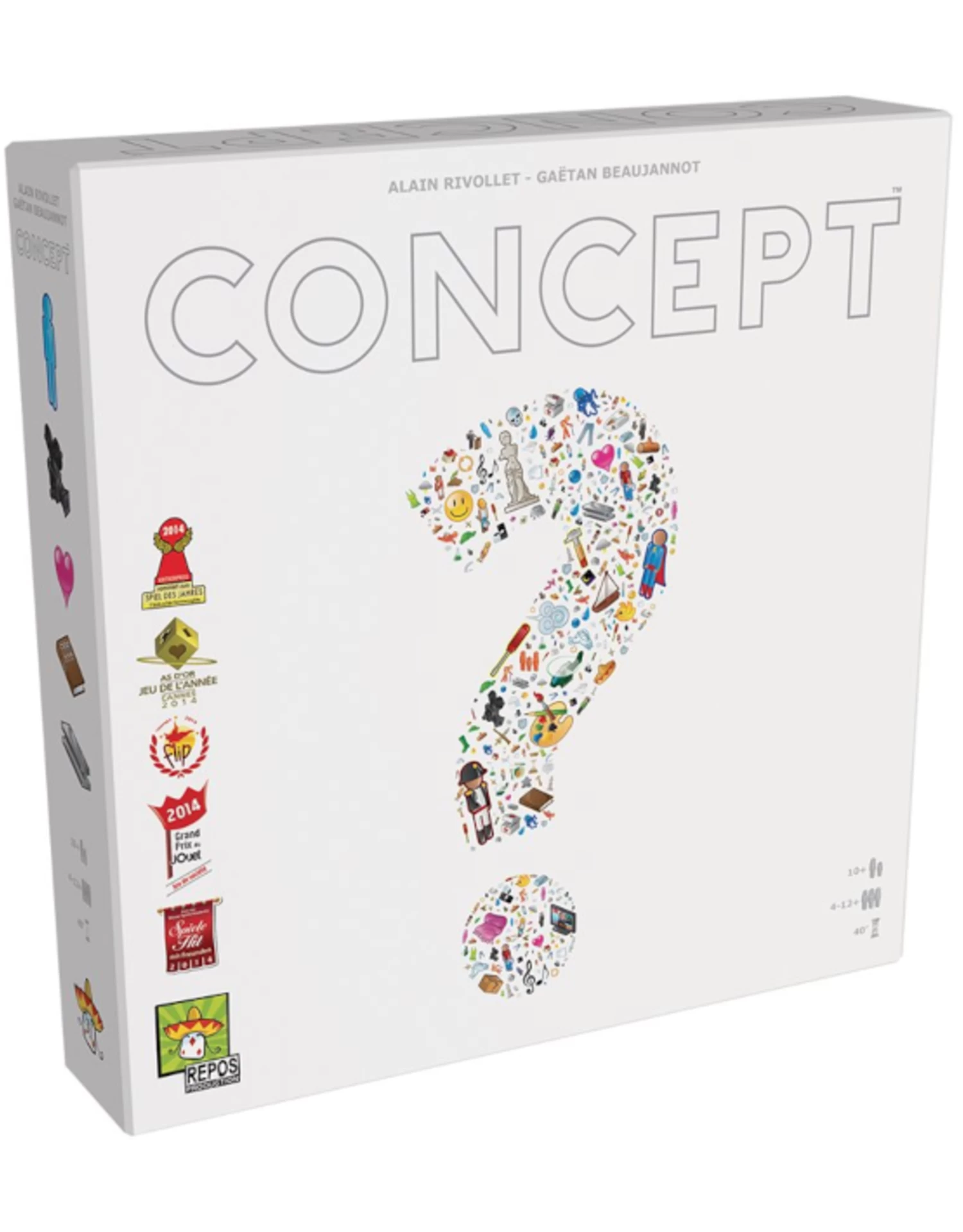 In Concept, your goal is to guess words through the association of icons. To get others to guess “milk”, the team might place the question mark icon (it signifies the main concept) on the liquid icon, then cubes of this color on “food/drink” and “white”. The first player to discover the word or phrase receives 2 victory points, the team receives points as well.