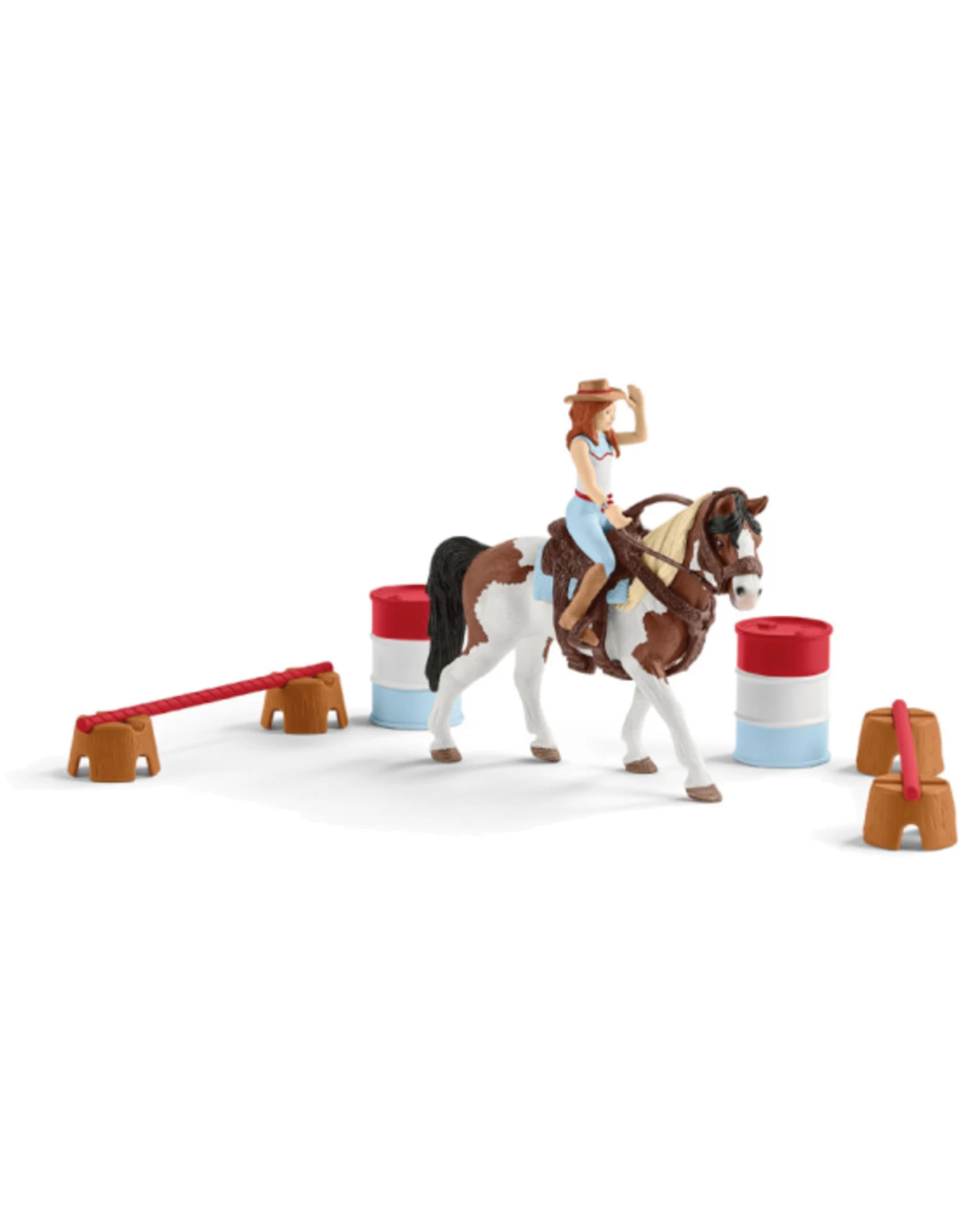 Includes: 1x girl, 1x Tennessee Walker mare, 1x saddle, 1x bridle with reins, 2x barrel, 2x hurdle, 4x obstacle log