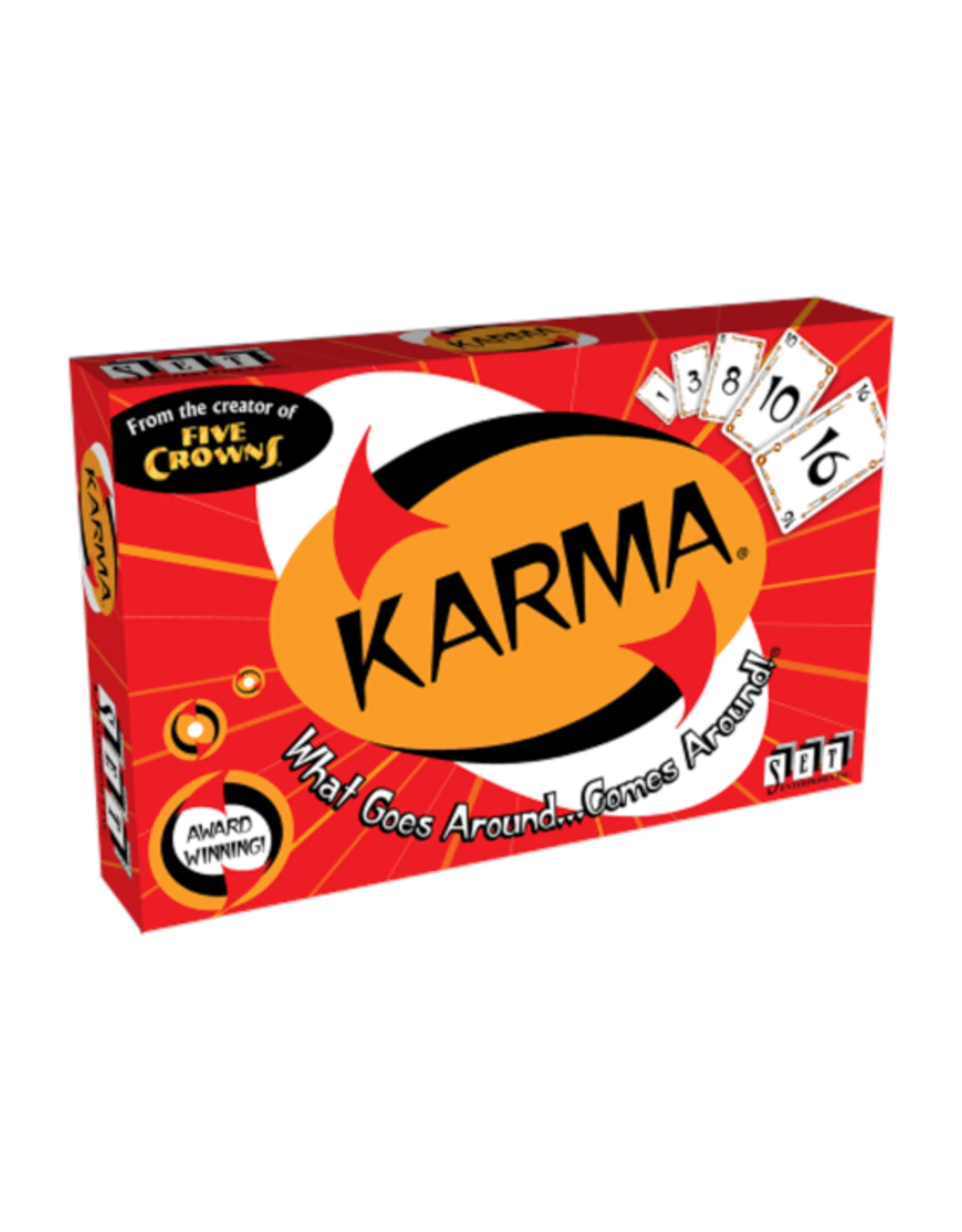 Karma is playfully competitive and infectiously fun! Race to get rid of all your cards by playing a card of equal or higher value, but watch outif you cant play a card, you have to take the whole discard pile! Luckily, there are Karma cards that could get you out of troubleand maybe cause trouble for someone else! Use them wisely, because what goes around comes around! Its a game of elimination, with multiple winners, and is a blast for the whole family!