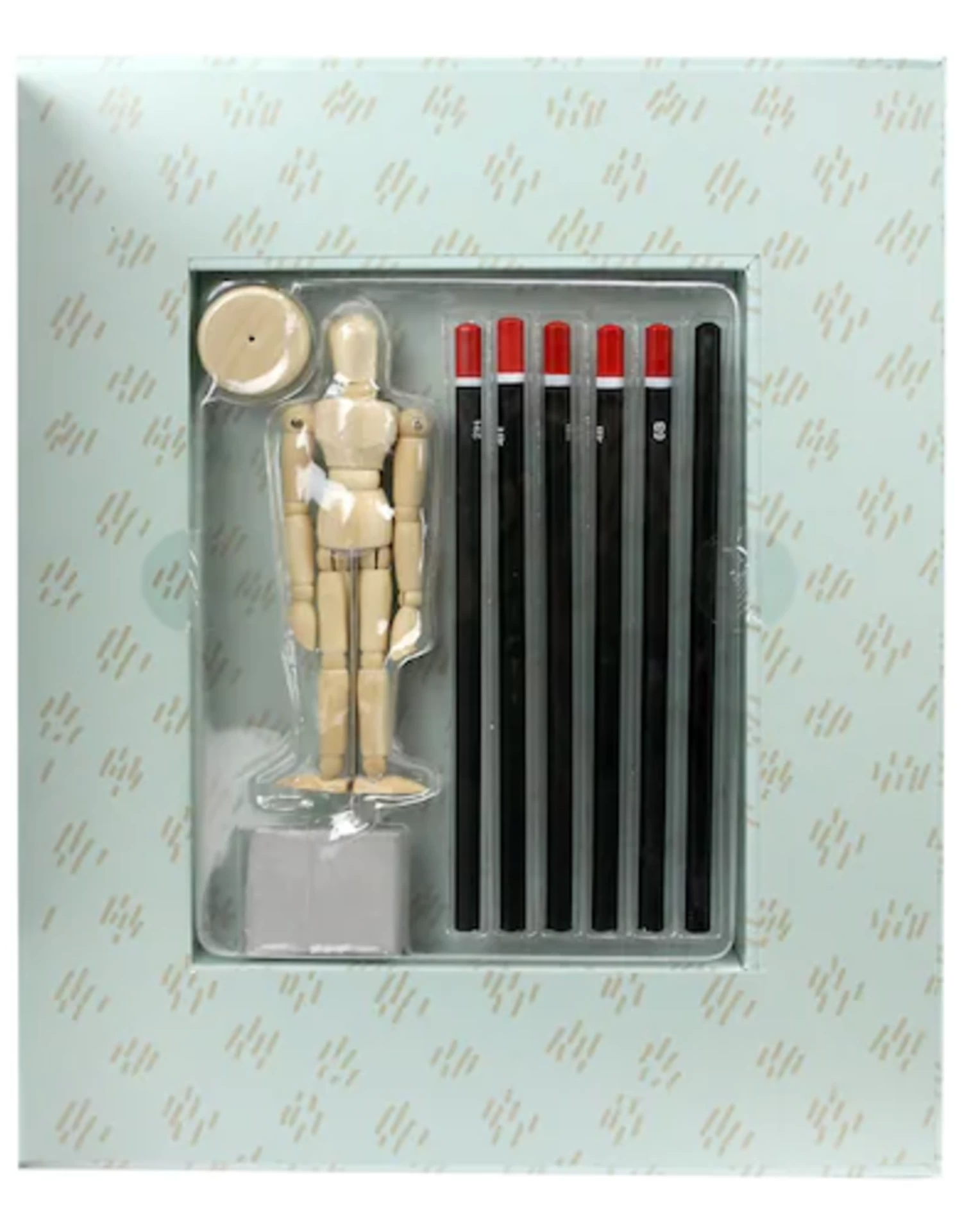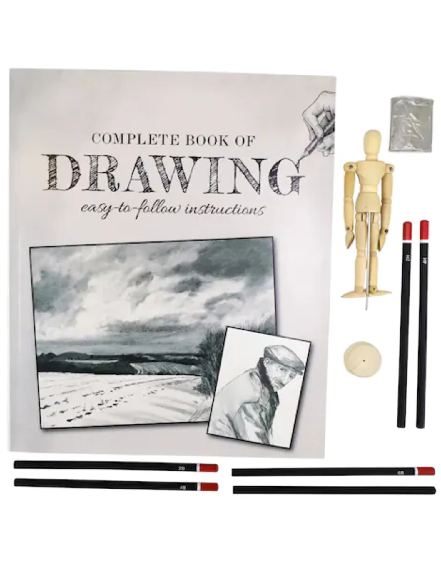 Includes: 5 artist drawing pencils, 1 charcoal pencil, 1 wooden figure model, 1 kneaded eraser, 1 instruction book, practice drawing paper