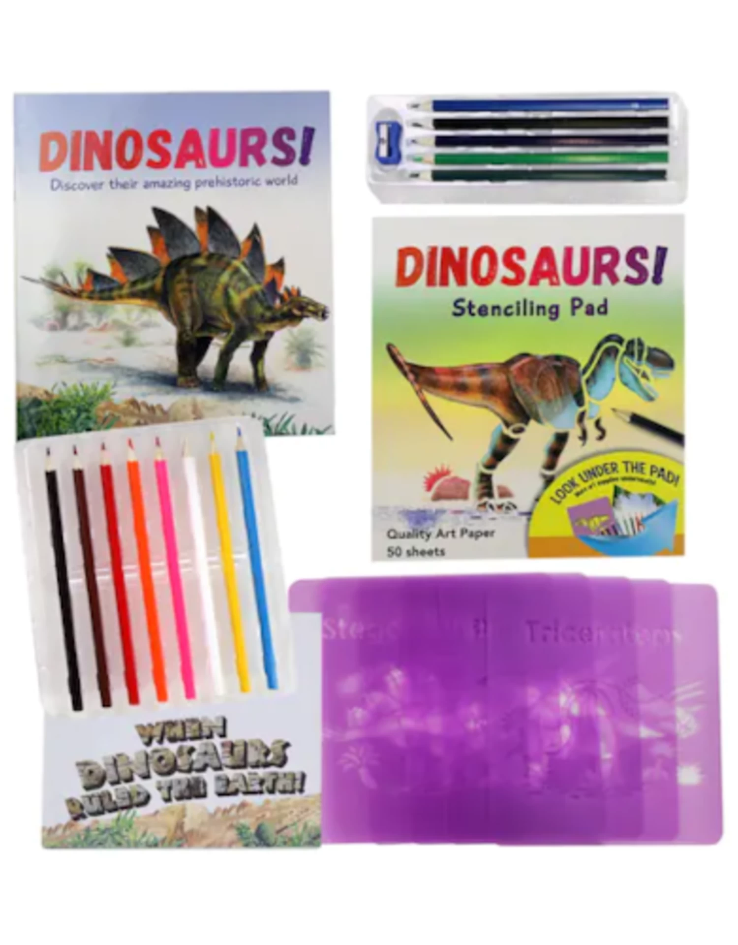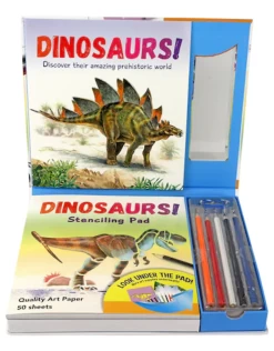 Find out how to use the stencils and the colored pencils included to draw 6 dinosaurs and their habitats.