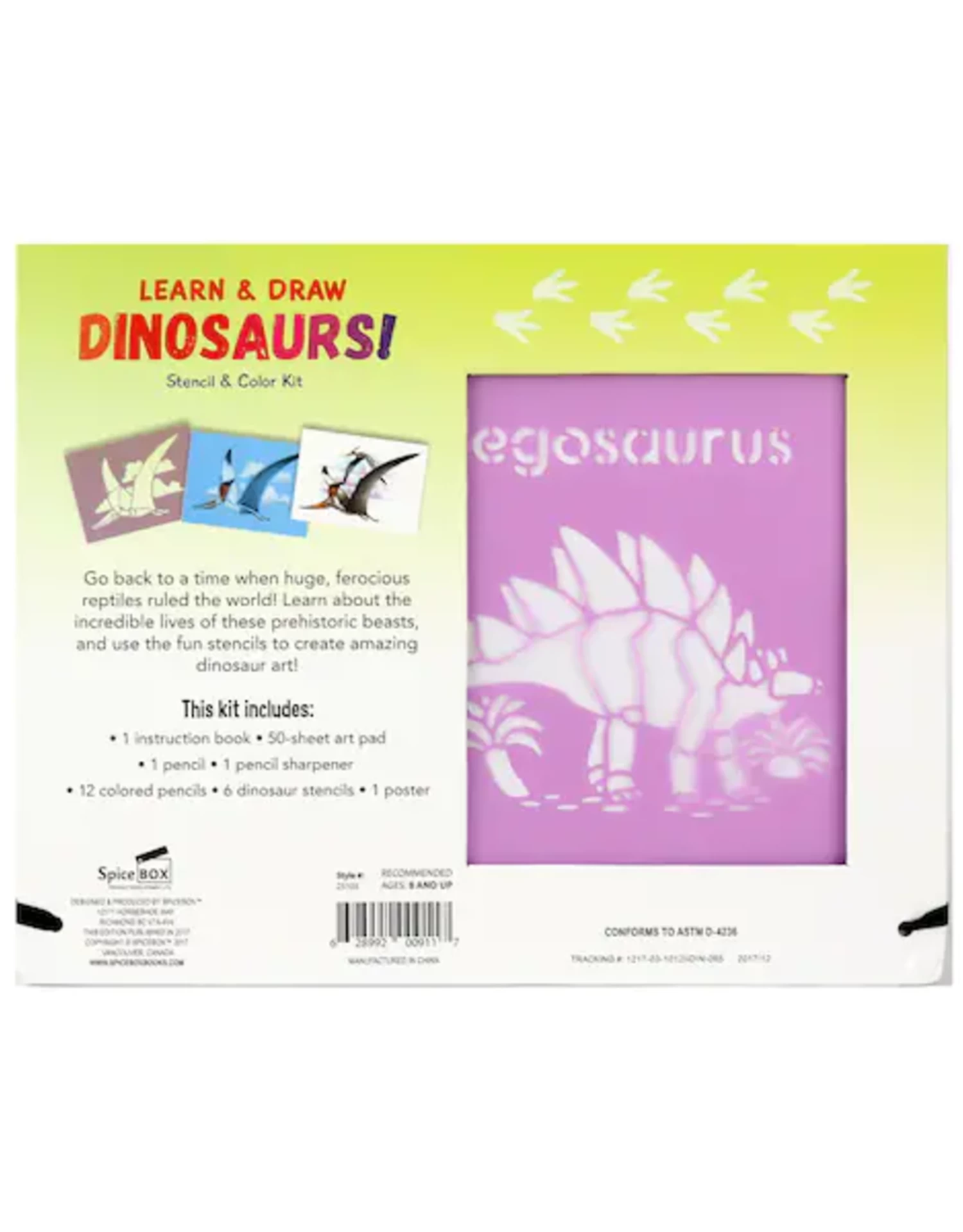 SpiceBox Imagine It Learn & Draw Dinosaurs Trace, draw and color dinosaurs! Go back to a time when huge, ferocious reptiles ruled the world. Learn about the incredible lives of these prehistoric beasts, and use the fun stencils to create amazing dinosaur art!