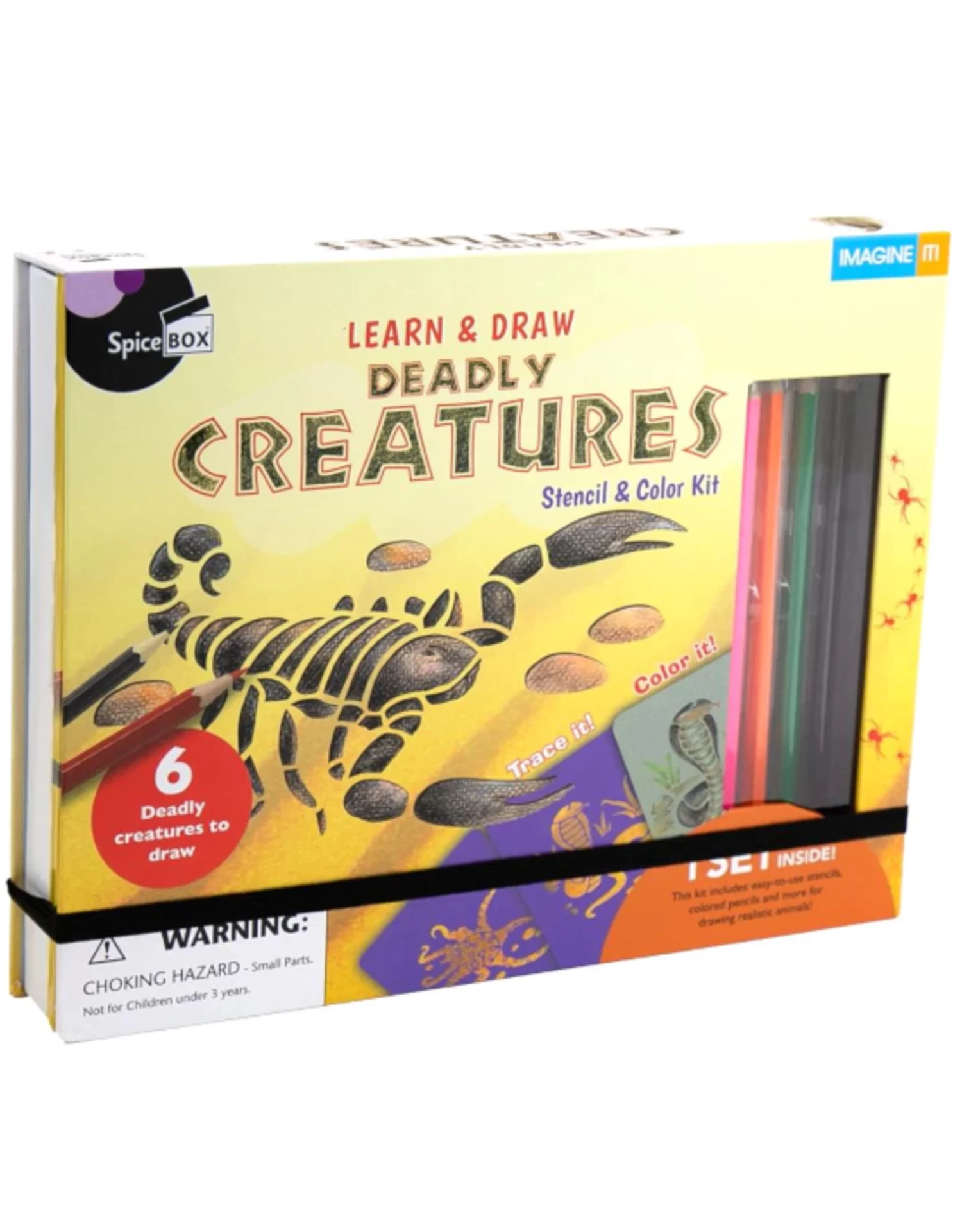 Kit Includes: 1 instruction book, 50 sheet art pad, pencil, pencil sharpener, 12 colored pencils and 6 creature stencils.
