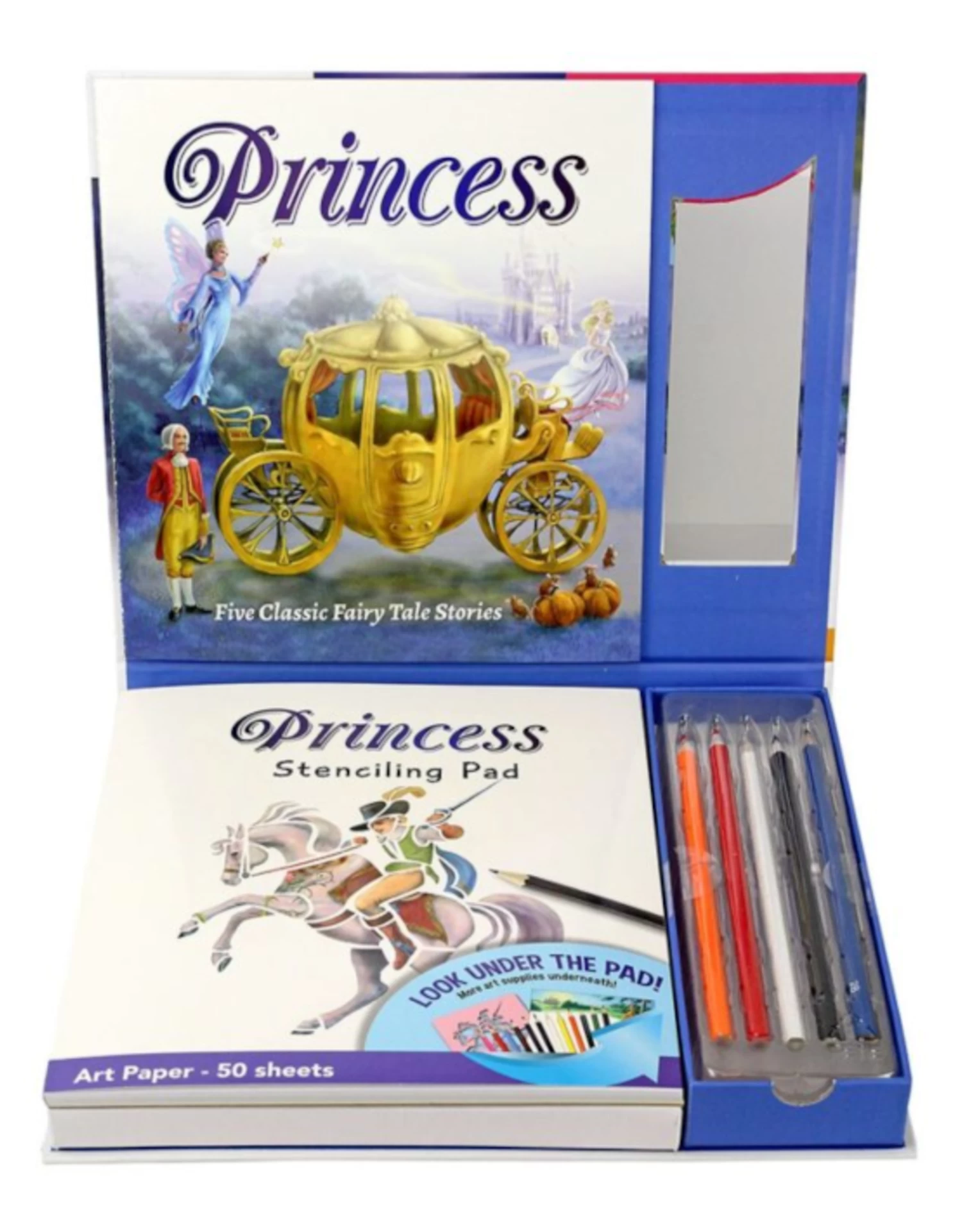 1 Fairy Tale Book, 1 Drawing pad (50 Sheets), 1 Pencil, 1 Glitter Glue, 12 Colored Pencils, 5 Stencils, 1 Poster