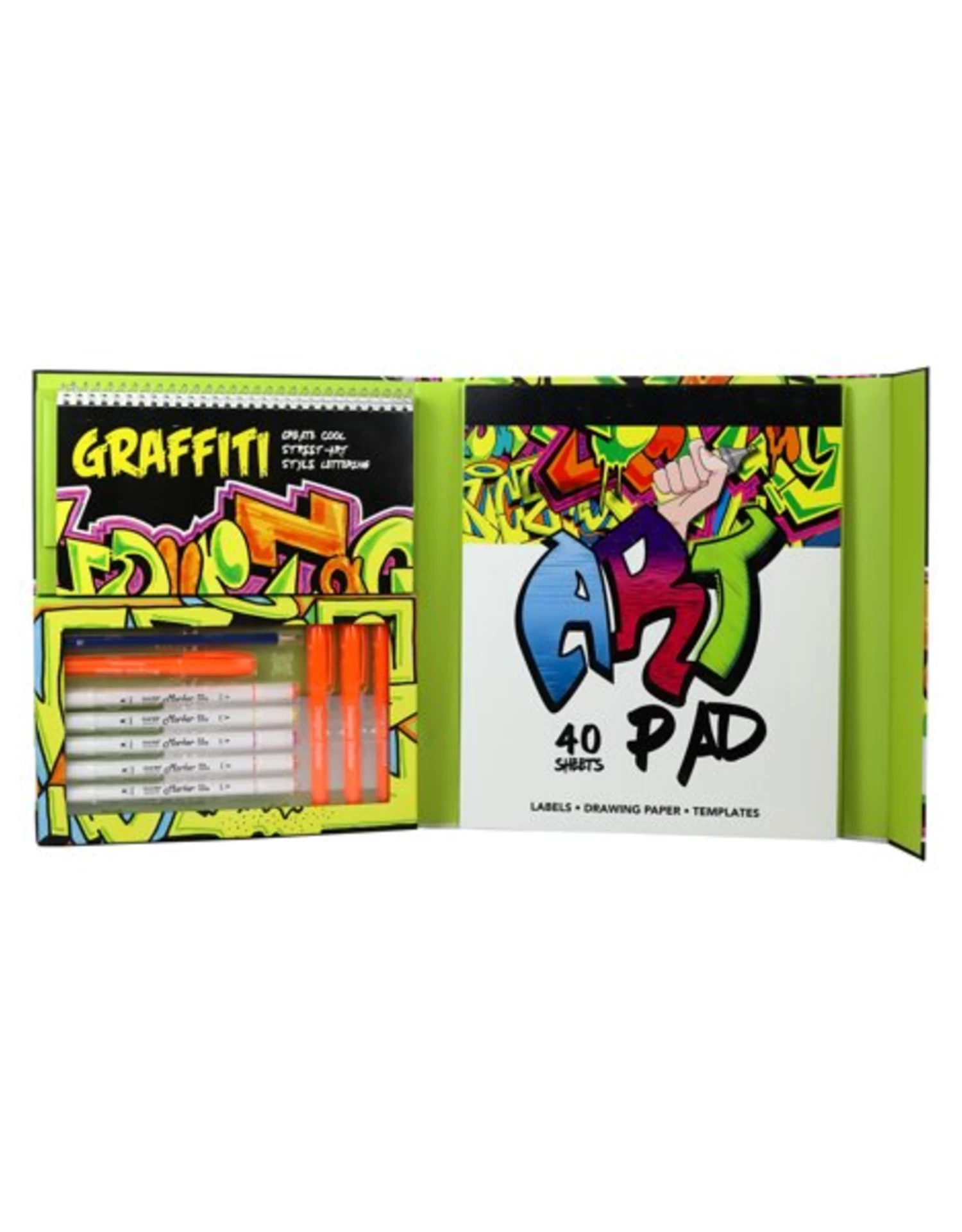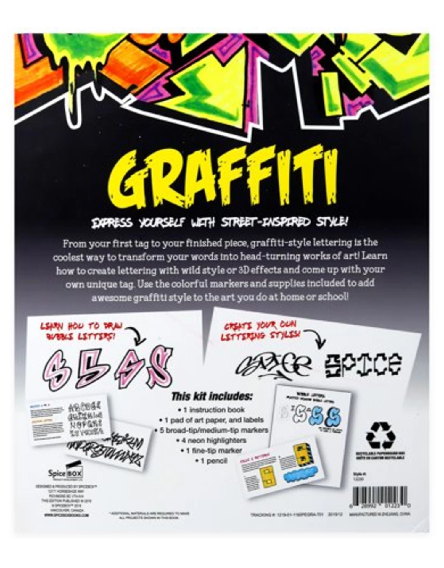 Express yourself with street-inspired style! From your first tag to your finished piece, graffiti-style lettering is the coolest way to transform your words into head-turning works of art! Learn how to create lettering with wild style or 3D effects and come up with your own unique tag. Use the colourful markers and supplies included to add awesome graffiti style to the art you do at home or school!