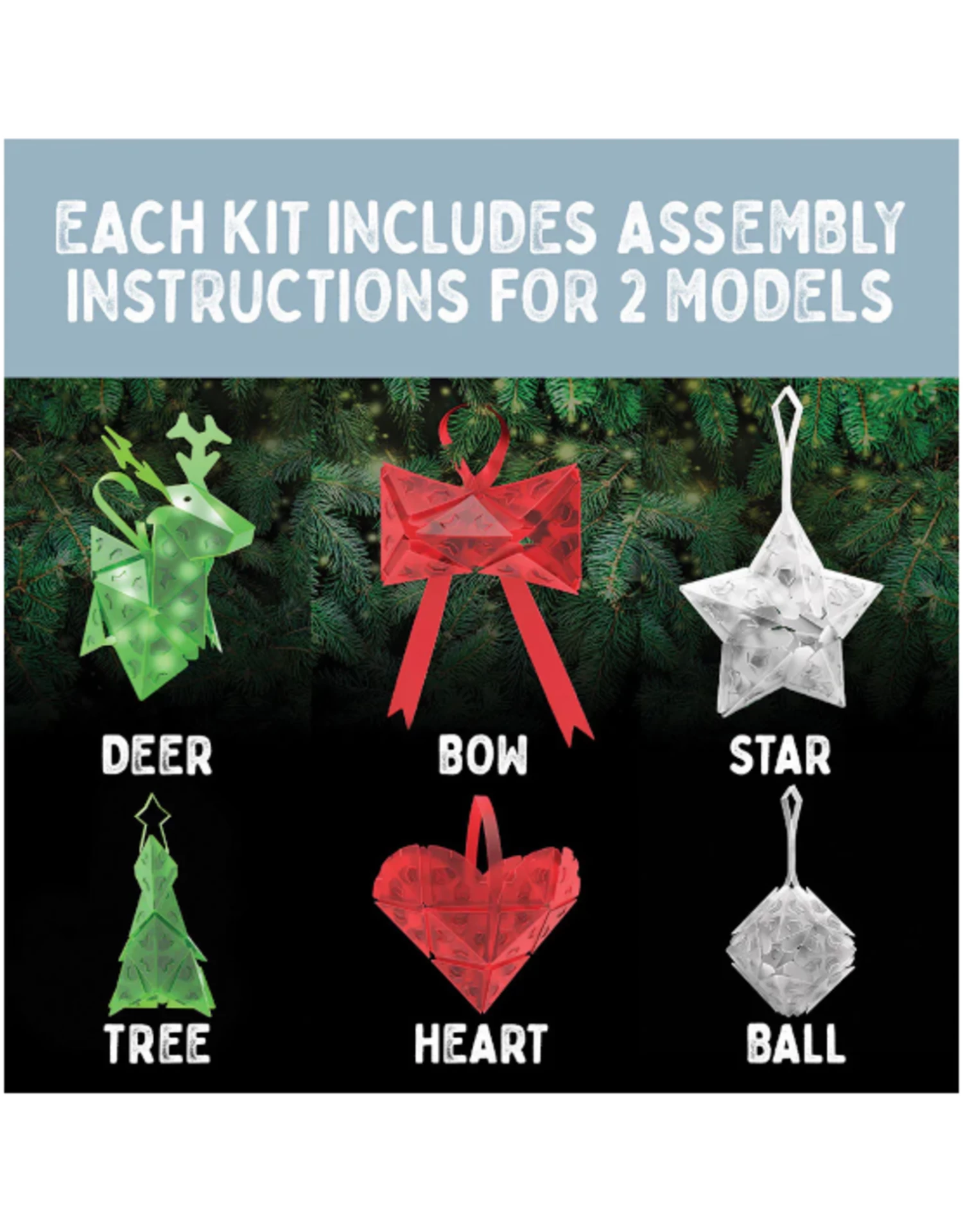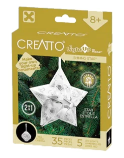 With 37 Creatto pieces and a string of 5 LED lights, you can build a white star or a ball ornament. The models have loops for use as ornaments. Battery-powered lights require 2 CR2032 batteries. Suitable for ages 8 and up.