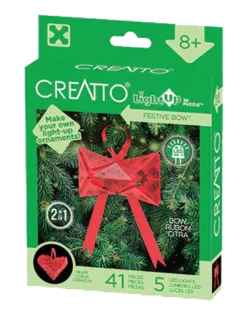 With 43 Creatto pieces and a string of 5 LED lights, you can build a red bow or a heart. The models have loops for use as ornaments. Battery-powered lights require 2 CR2032 batteries. Suitable for ages 8 and up.