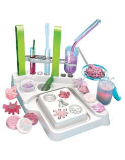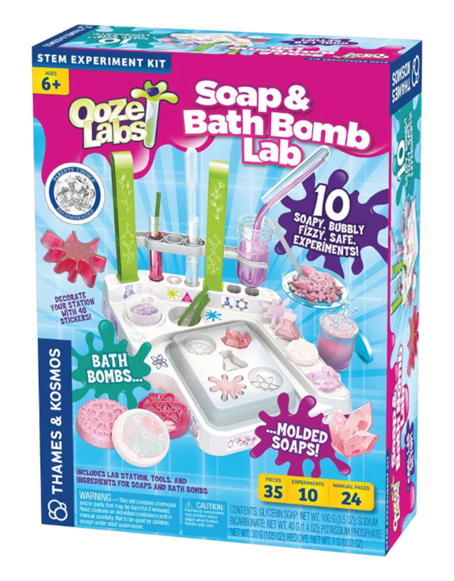 Real science and pretend play come together in this activity-filled kit that can be used alone or as an extension of the Ooze Labs Chemistry Station (a Parents’ Choice Silver Honor winner!). As you mold different glycerin soap shapes, you learn about the chemical properties of soap that help it pick up and wash away dirt. While you’re concocting bath bombs, you learn about how acids and bases combine to form fizzing reactions, and what a pH level is. Expand your cosmetics knowledge with an overview of the biology of skin care and other science related to soap and bath products. All materials and chemicals are non-toxic.