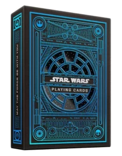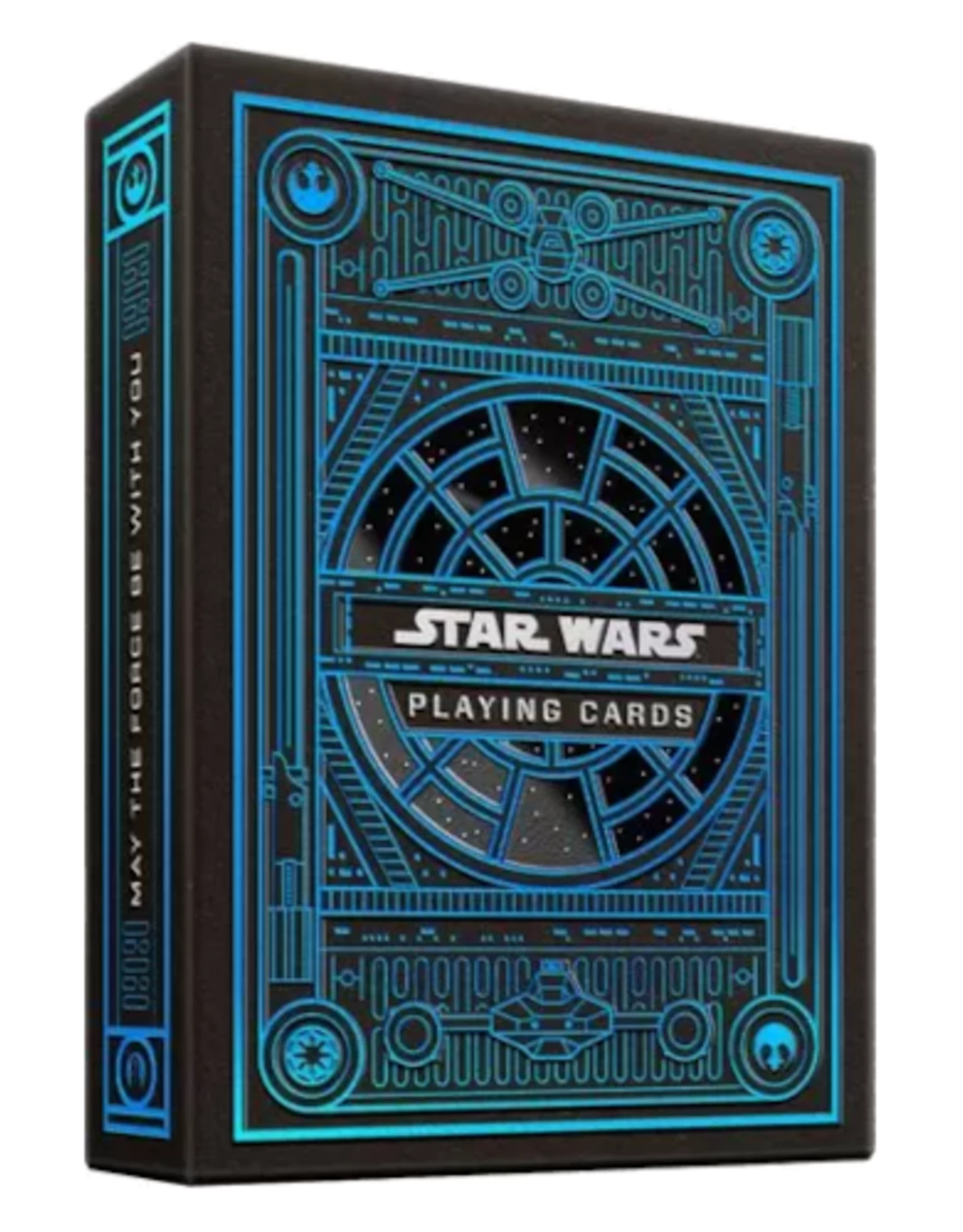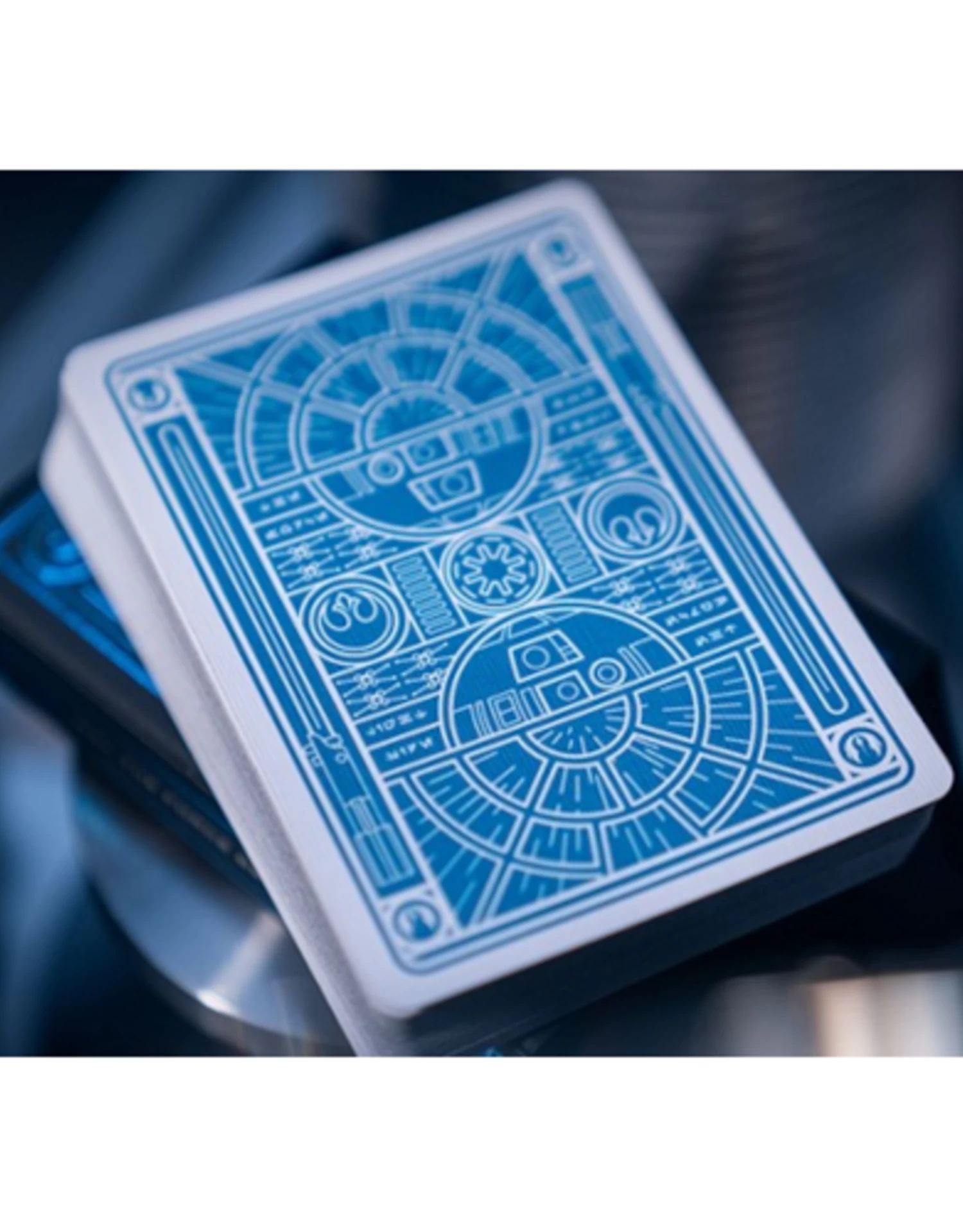 - The blue deck back design features the top of R2 D2 and the Rebel Alliance symbol. In the center, a repeating pattern of X wing starfighters supports two lightsabers on each side edge.