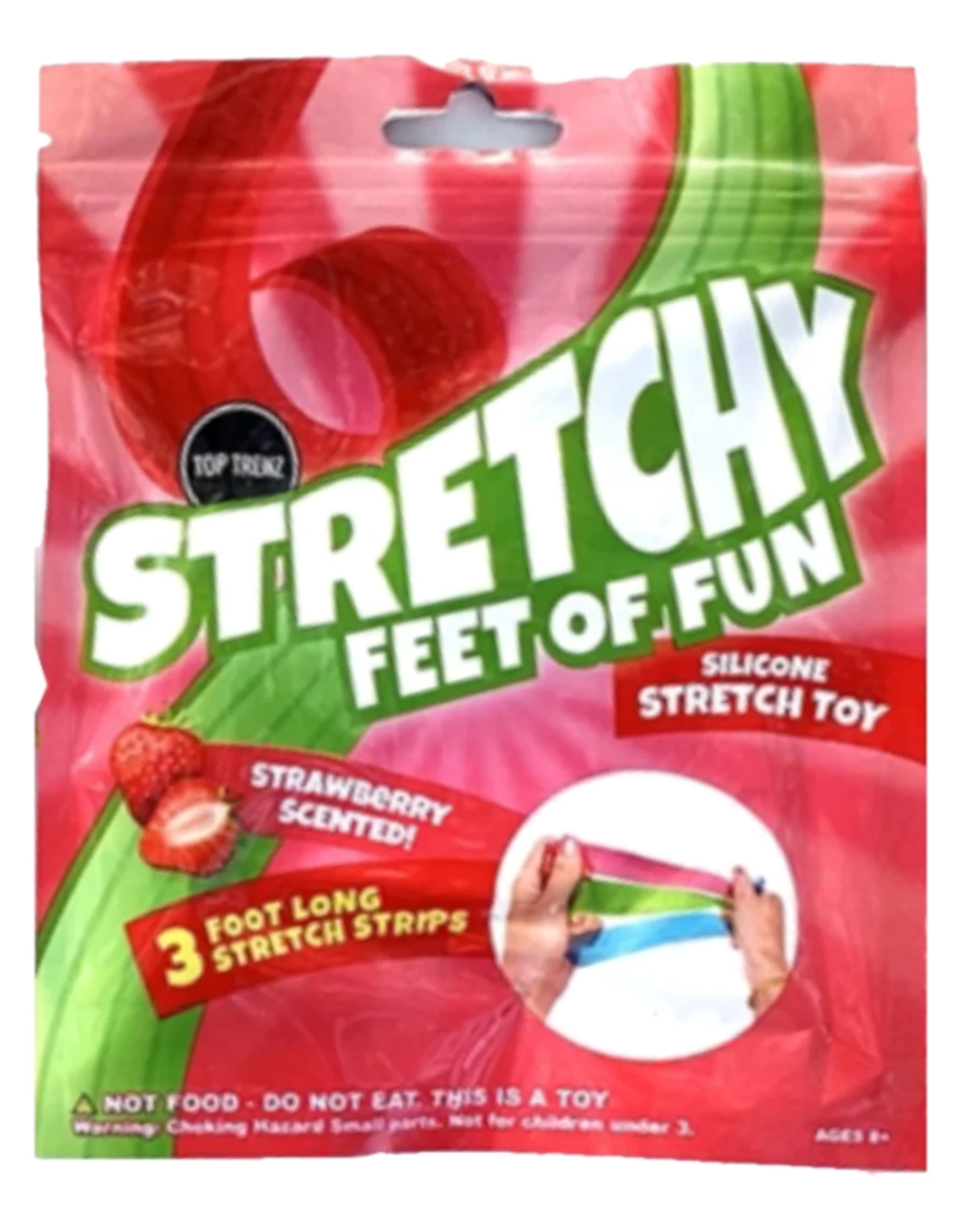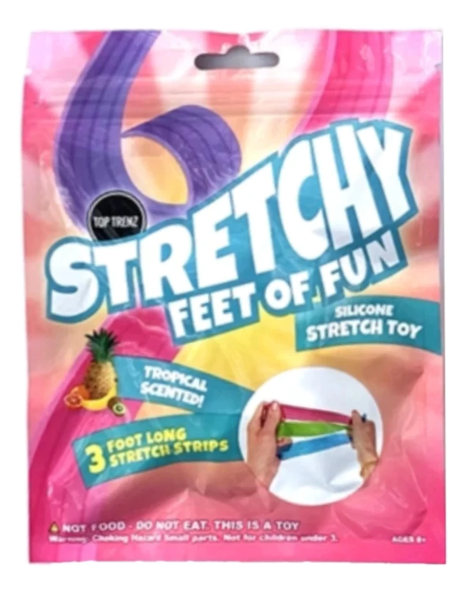 Introducing OMG Stretchy Feet of Fun. The fun scented silicone stretch toy that you can stretch, pull, knot, roll and squeeze. Includes 3 scented foot-long silicone stretch strips.