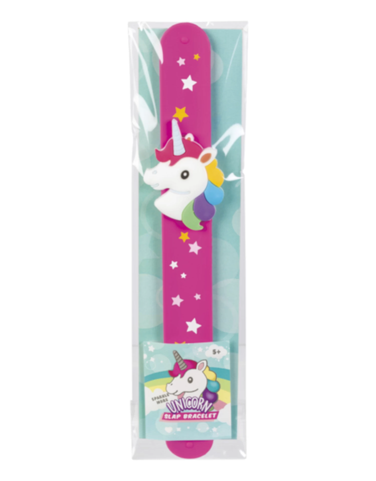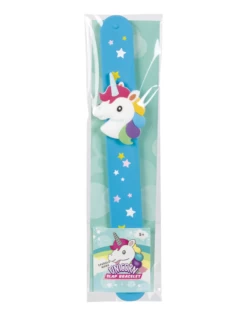 With a slap, the 8.75 inch unicorn bracelet goes on in a snap. Slide the unicorn charm to adjust for a custom look. Assorted colours.