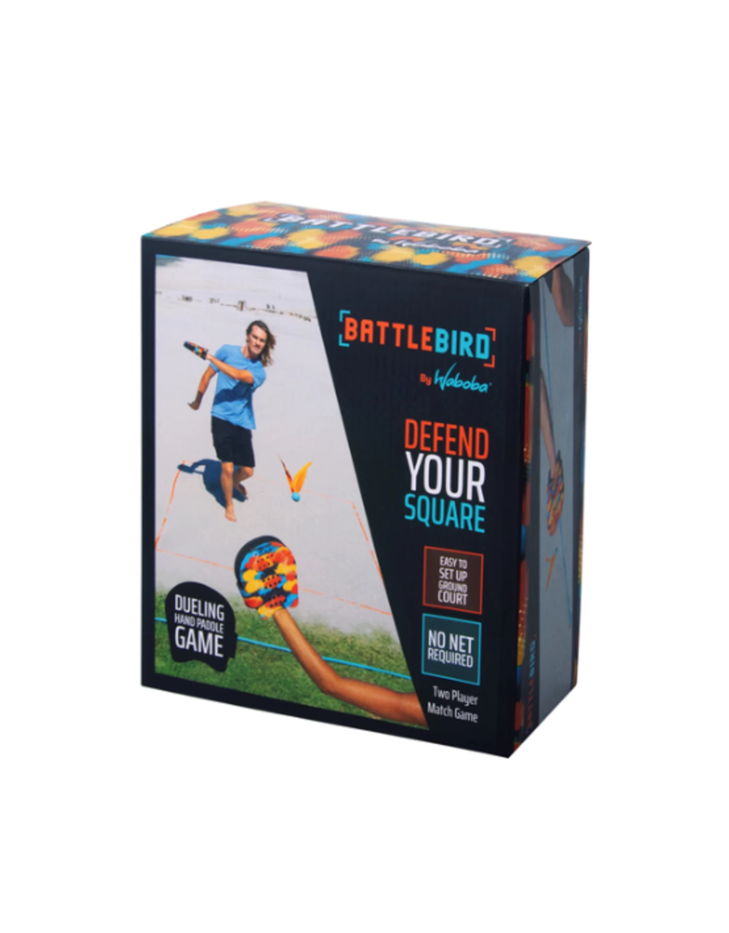 Defend your square! BattleBird is dueling two player match game featuring VOLI hand paddles, a new fast-spinning birdie, and two squares. Play blue vs orange . No net required! Play in the backyard, park, or beach. Hit the birdie to land in your opponent’s square to score points.