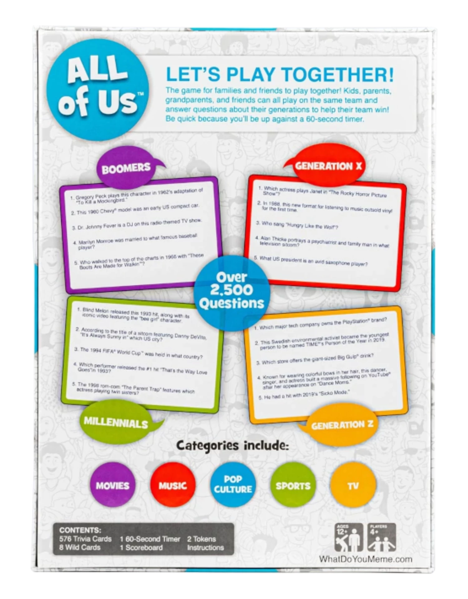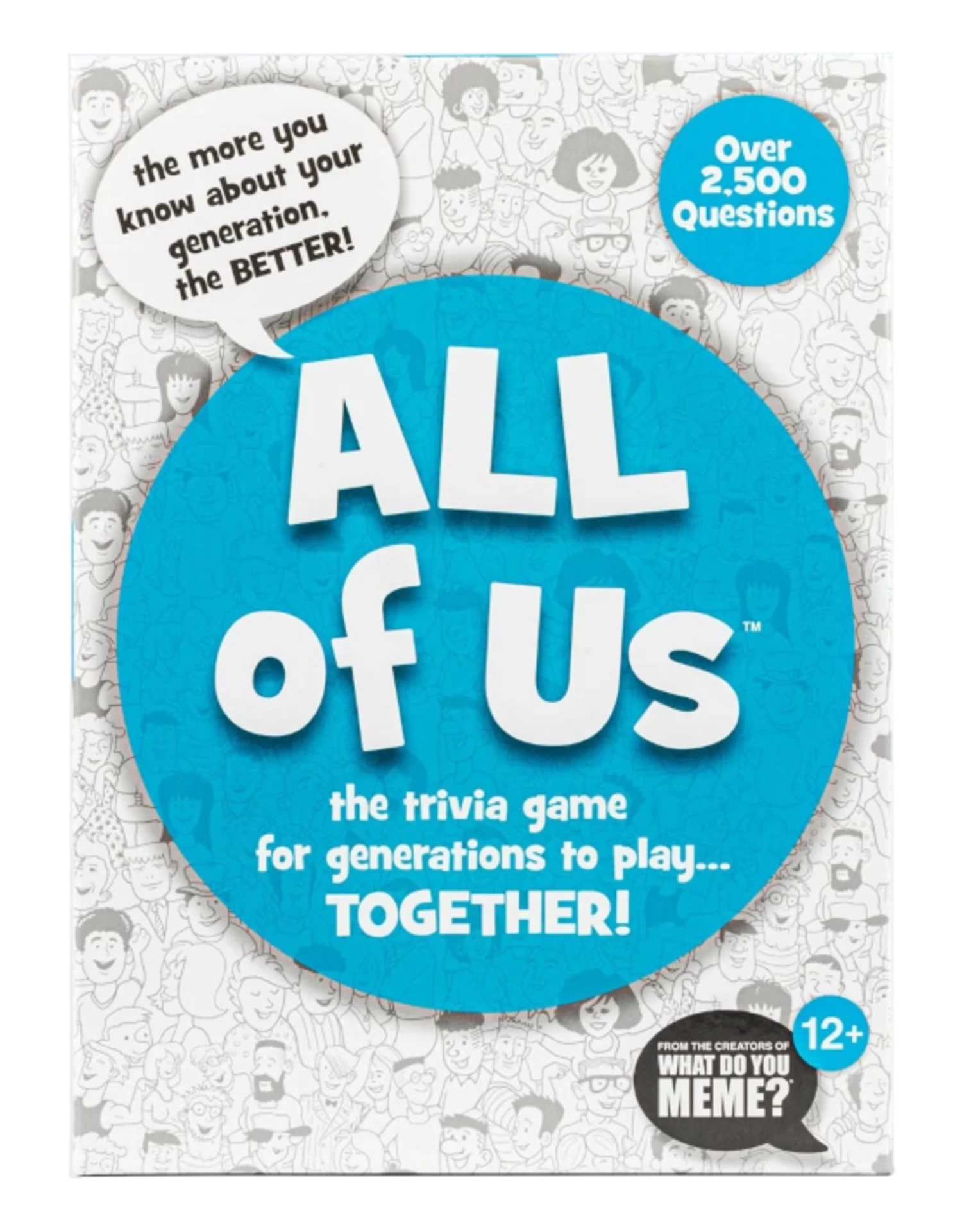 All of Us™ is the trivia game for generations to play… together! This game is meant to encourage you to have players from different generations on the same team–kids, parents, grandparents and friends all playing together.