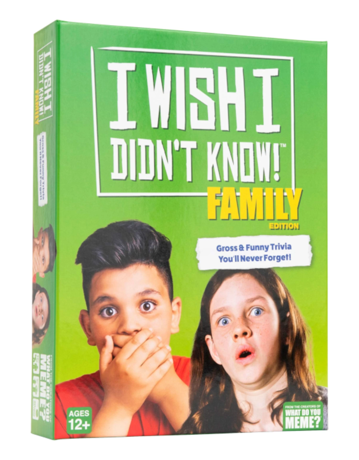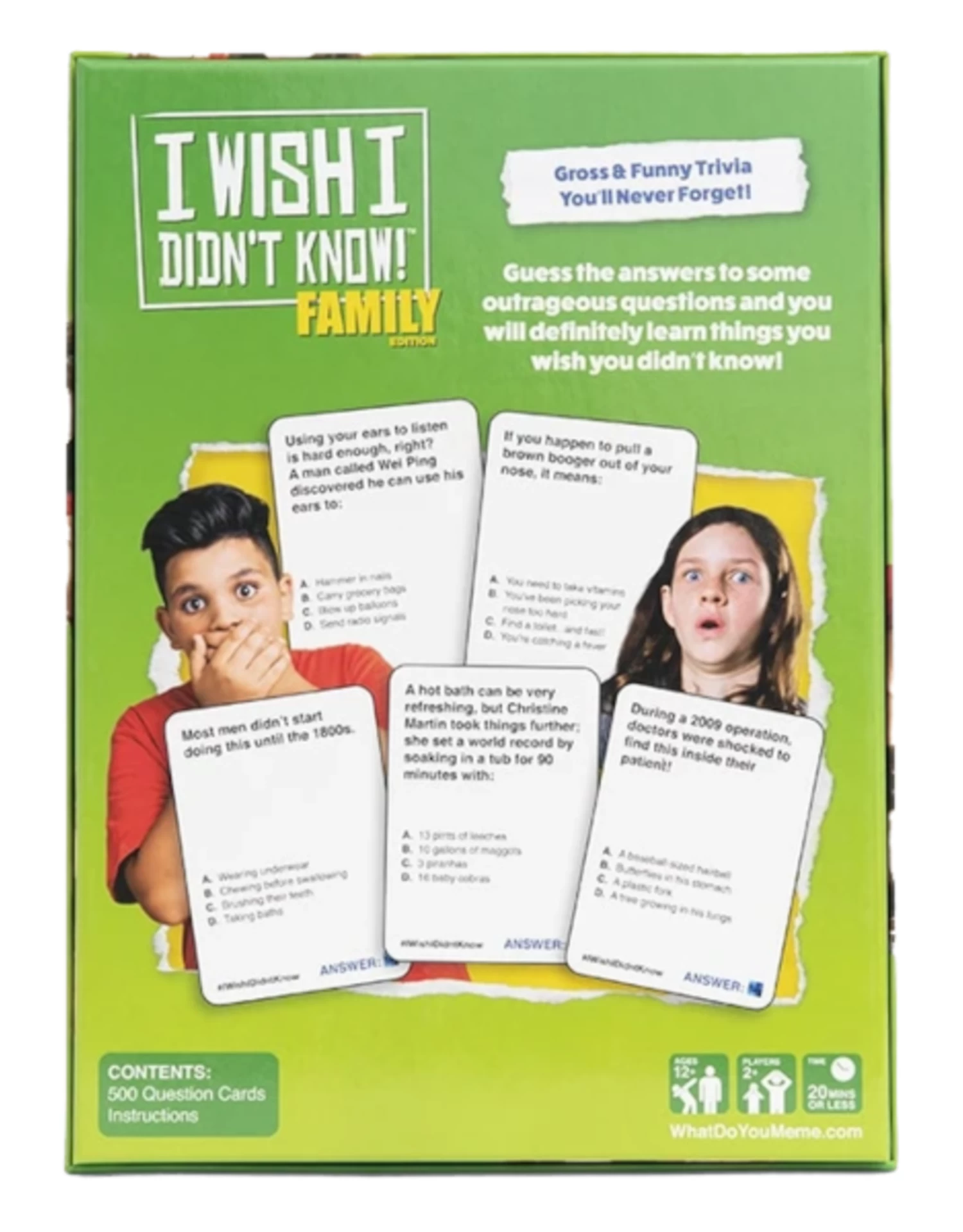 You could go your whole life without knowing these ridiculous facts — and we’re here to fix that! Introducing I Wish I Didn’t Know! Family Edition. Our newest family game is packed with the funniest, grossest, and most shocking trivia. You and your family will *love* to be disgusted by the trivia game’s 500 questions that vary across a range of wild topics — from bathtub leeches to rainbow boogers. Game night’s never been grosser — and hey Mom, it’s technically educational!