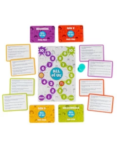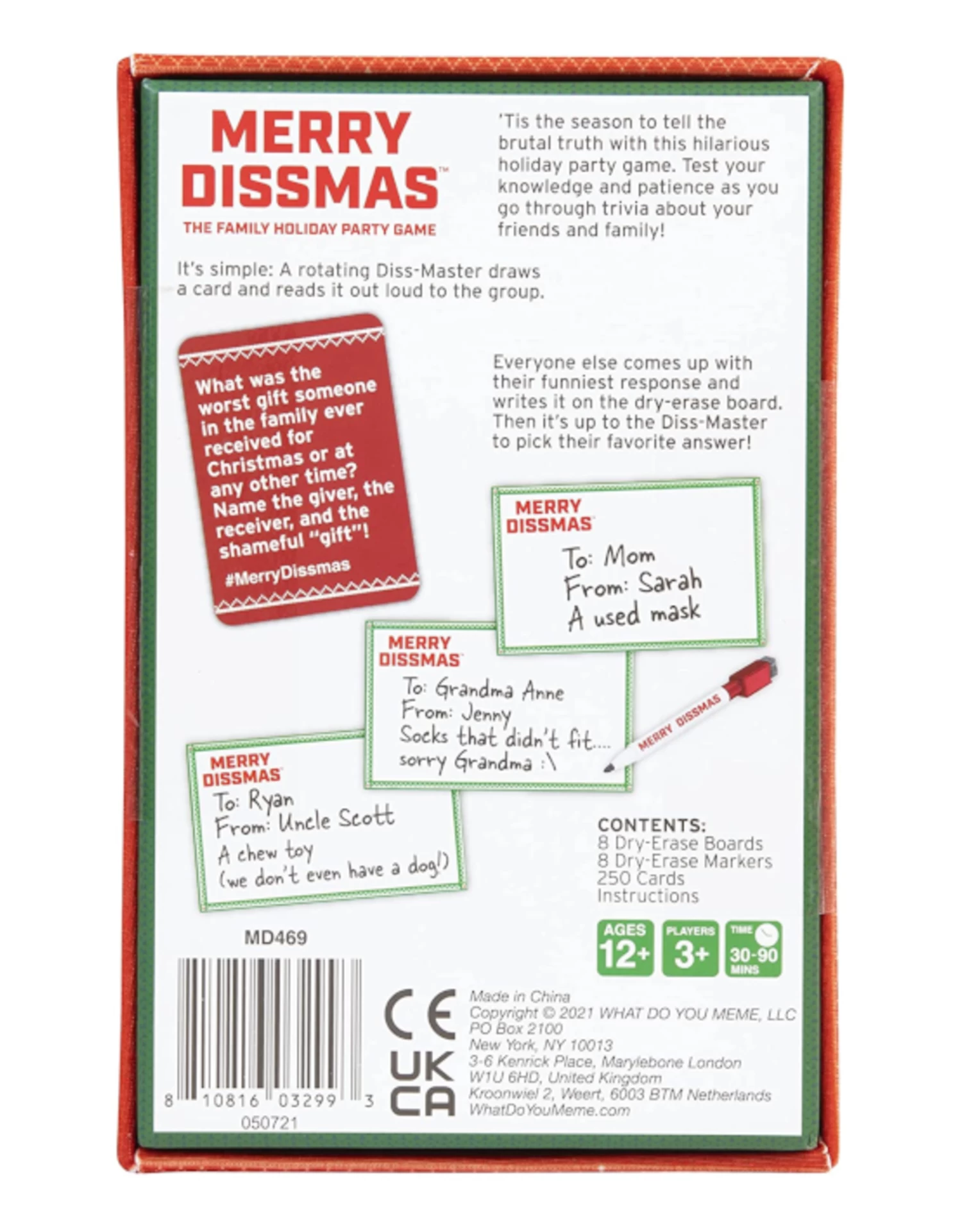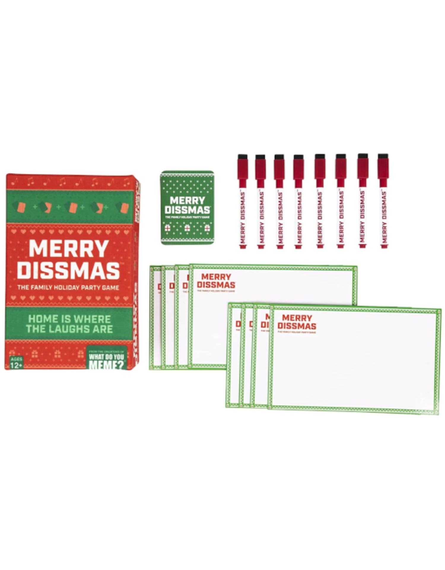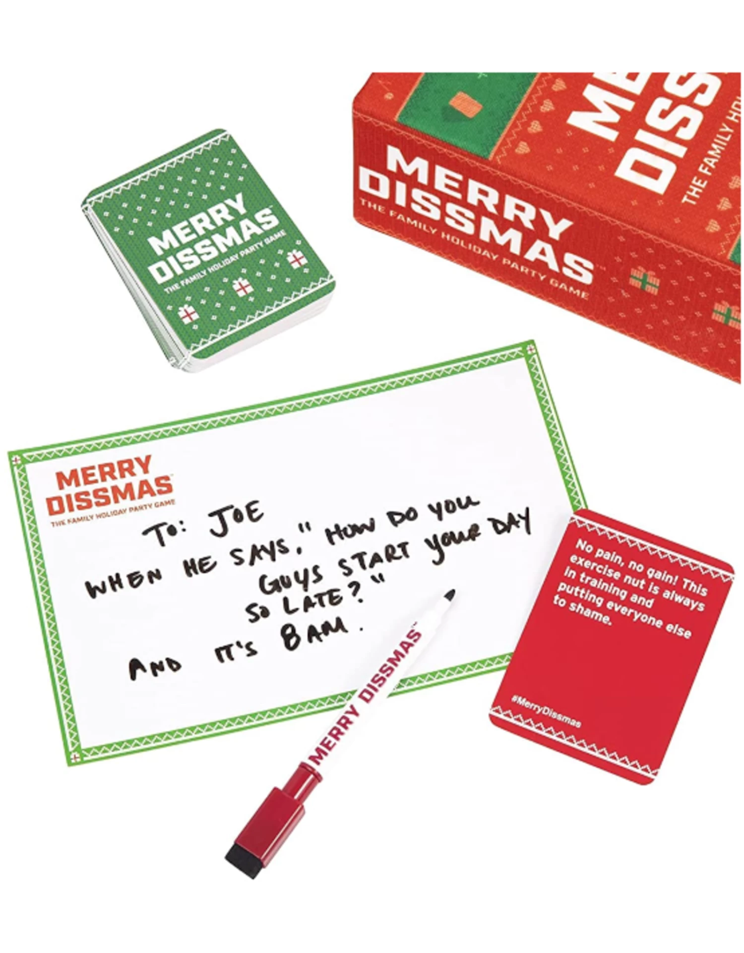 A rotating Diss-Master reads a card out loud to the group (for example: Who’s the worst gift-giver? The chronic over-sharer? The pickiest eater?). Everyone else writes down their answer on their dry-erase boards, and then it’s up to the Diss-Master to pick their favorite answer— after reading all the responses out loud, of course!