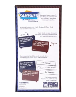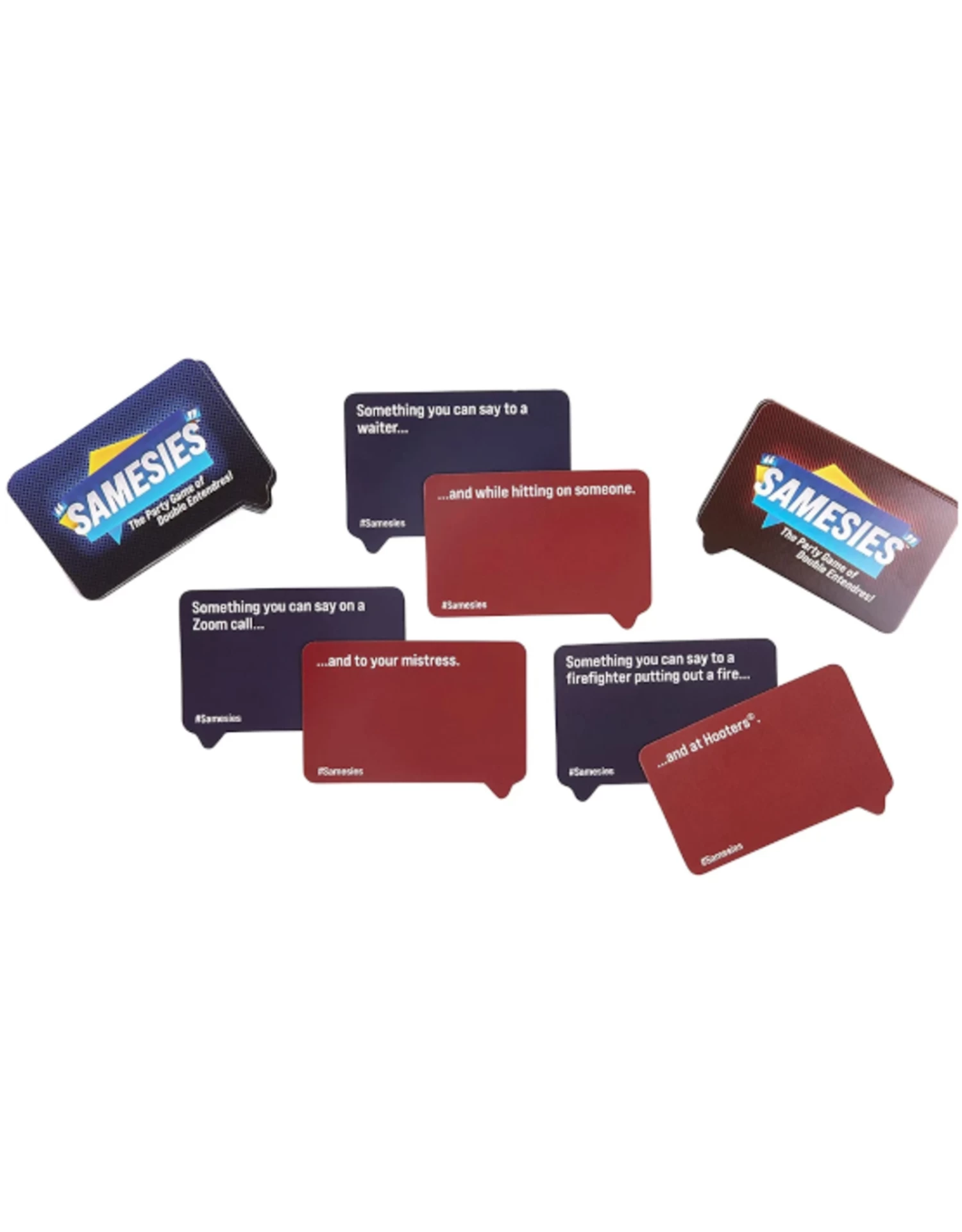 Time to start using that dirty mind for good… or at least for fun! Introducing Samesies, the party game full of double entendres. The rules are easy: Players takes a ”Safe” Card and a “Risky” Card, and compete to find the funniest phrase that suits both situations. The perfect game for those who just can’t help but build a bridge between normal and naughty.